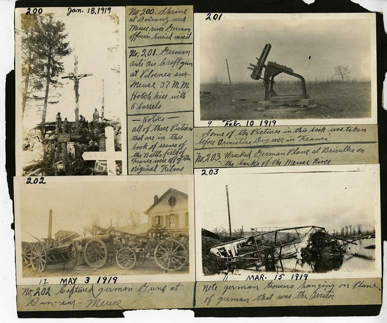 No 200. Shrine at Donavany near Meuse river German officers buried near it No. 201. German anti air craft gun at Vilosnes sur-Meuse 27 M.M. Hotchkiss with 5 barrels – Notice – all of these Pictures that are in this book of scenes of the Battlefield of France were off of the original Films No. 202 Captured german Guns at Dun-sur-Meuse Some of the Pictures in this book was taken before Armistice Day over in France No. 203 Wrecked German Plane at Brieulles on the bank of the Meuse River note german trousers hanging on Plane of german that was the aviator