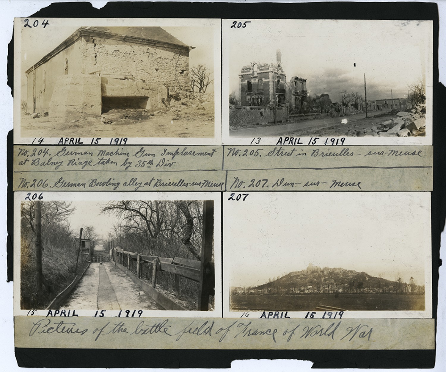 No. 204. German machine Gun Implasement at Balney Ridge taken by 35th Div No. 205. Street in Brieulles-sur-Meuse No. 206. German Bowling alley at Brieulles-sur-Meuse No. 207. Dun-sur-Meuse Pictures of the battle field of France of World War