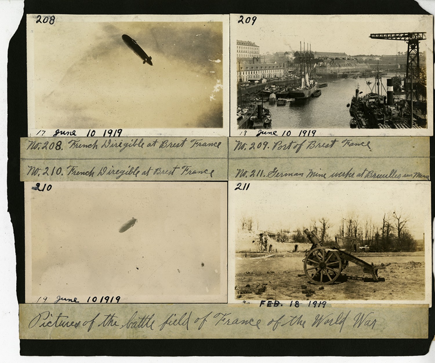 No. 208. French Dirigible at Brest France No. 209. Port of Brest France No. 210. French [Dirigible] at Brest France No. 211. German Mine werfer at Brieulles sur Meuse Pictures of the battle field of France of the World War