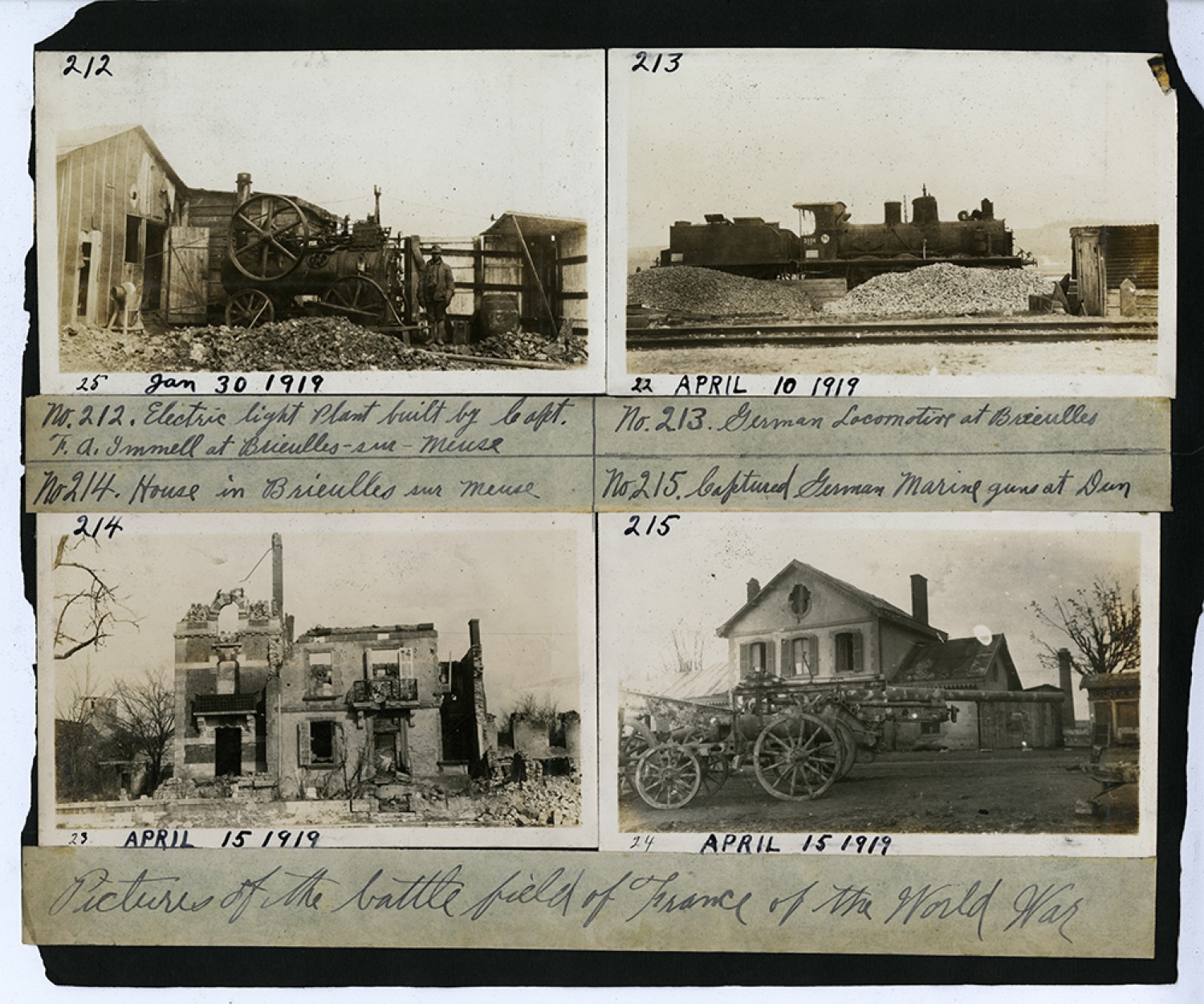 No. 212. Electric light Plant built by Capt. F.A. Immell at Brieulles-sur-Meuse No. 213. German Locomotive at Brieulles No 214 House in Brieulles sur Meuse No. 215. Captured German Marine gunes at Dun Pictures of the battle field of France of the World War