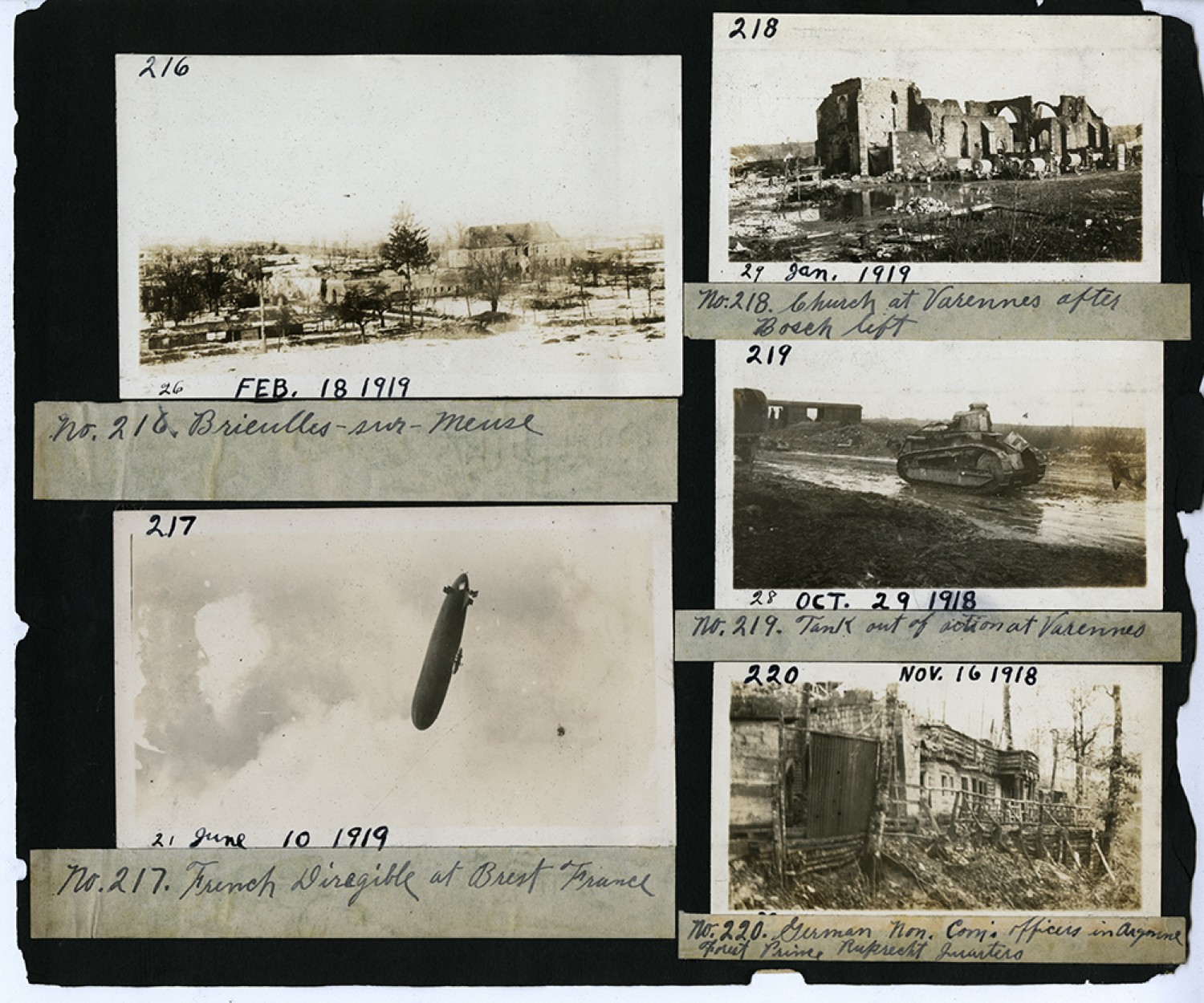 No. 216. Brieulles-sur-Meuse No. 217. French [Dirigible] at Brest France No. 218 Church at Varennes after Bosch left No. 219. Tank out of action at Varennes No. 220 German Non. Com’s officers in Argonne Forest Prince Ruprecht Quarters