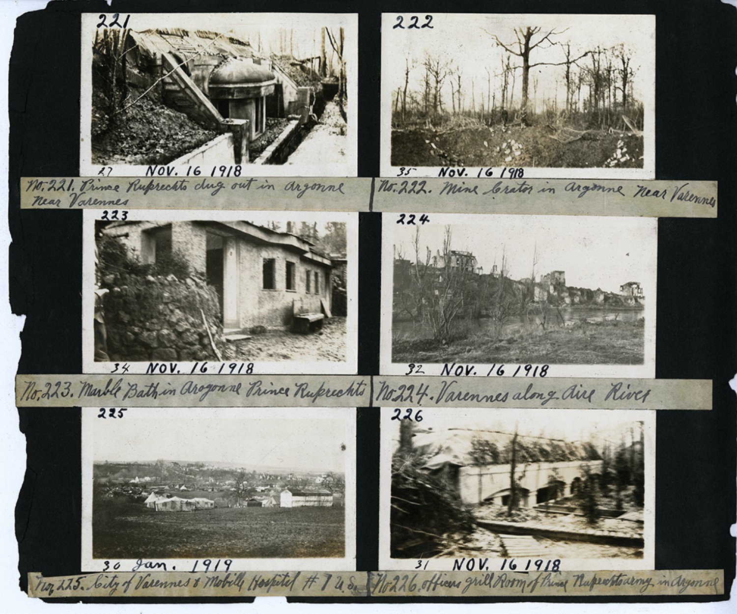 No. 221. Price Ruprechts dug out in Argonne near Varennes No. 222. Mine Crator in Argonne near Varennes No. 223. Marble Bath in Argonne Prince Ruprechts No. 224. Varennes along Aire River No. 225. City Carennes & Mobile Hospital #7 U.S. No 226. Officers grill Room of Price Ruprechts army in Argonne