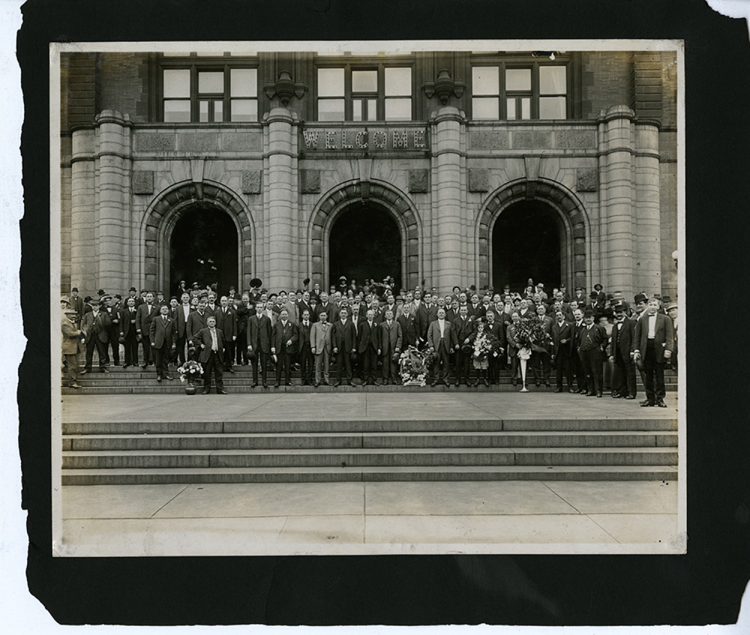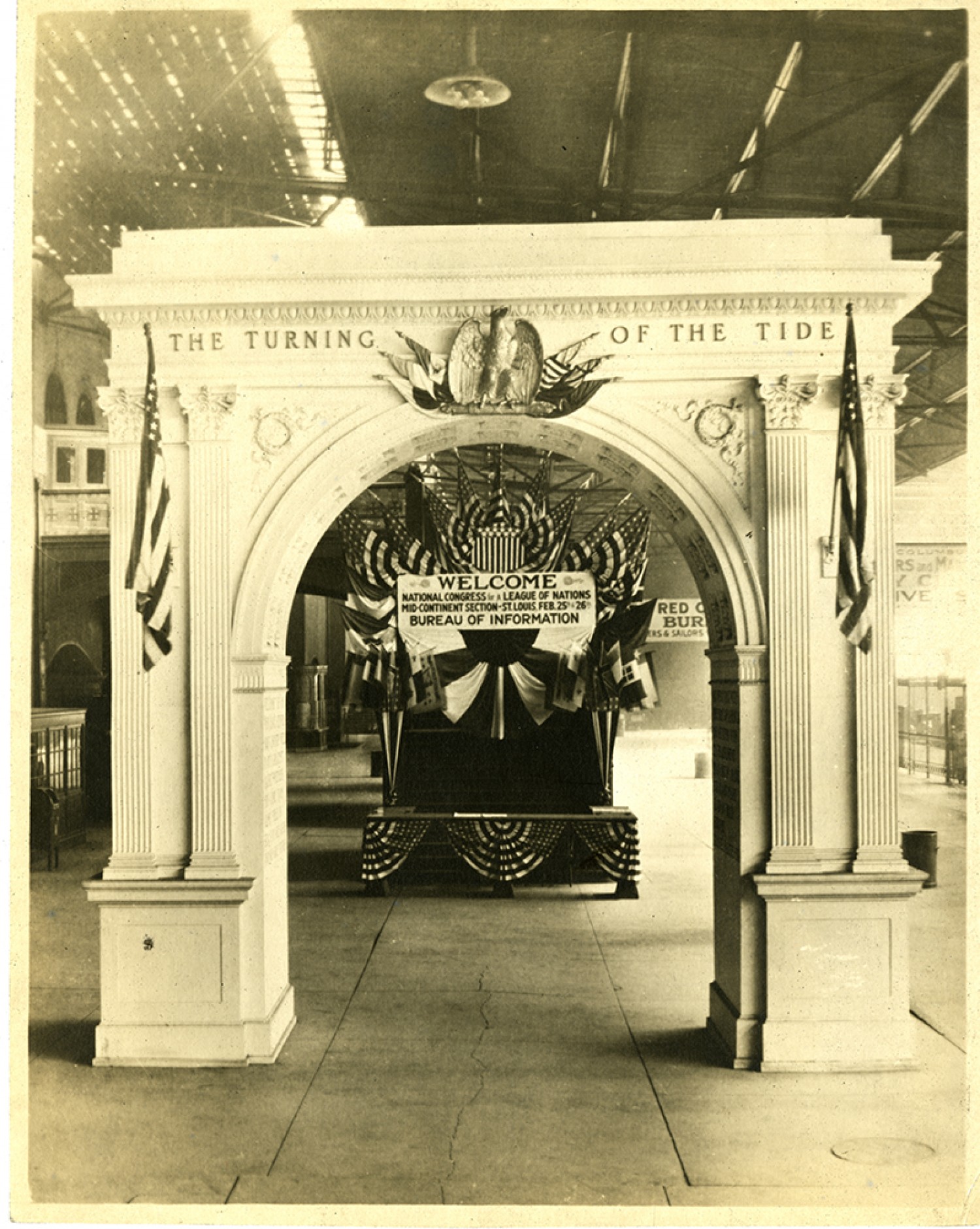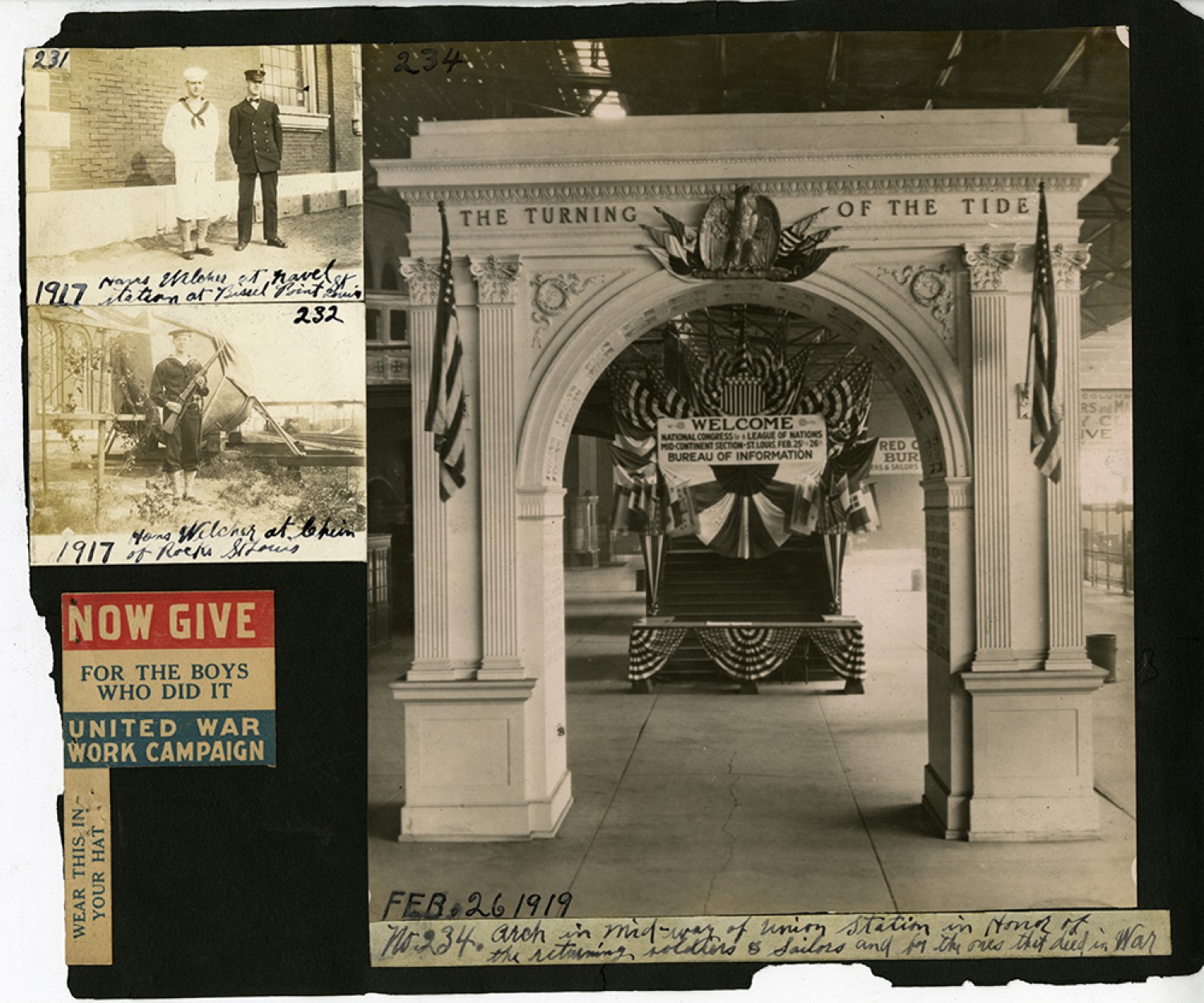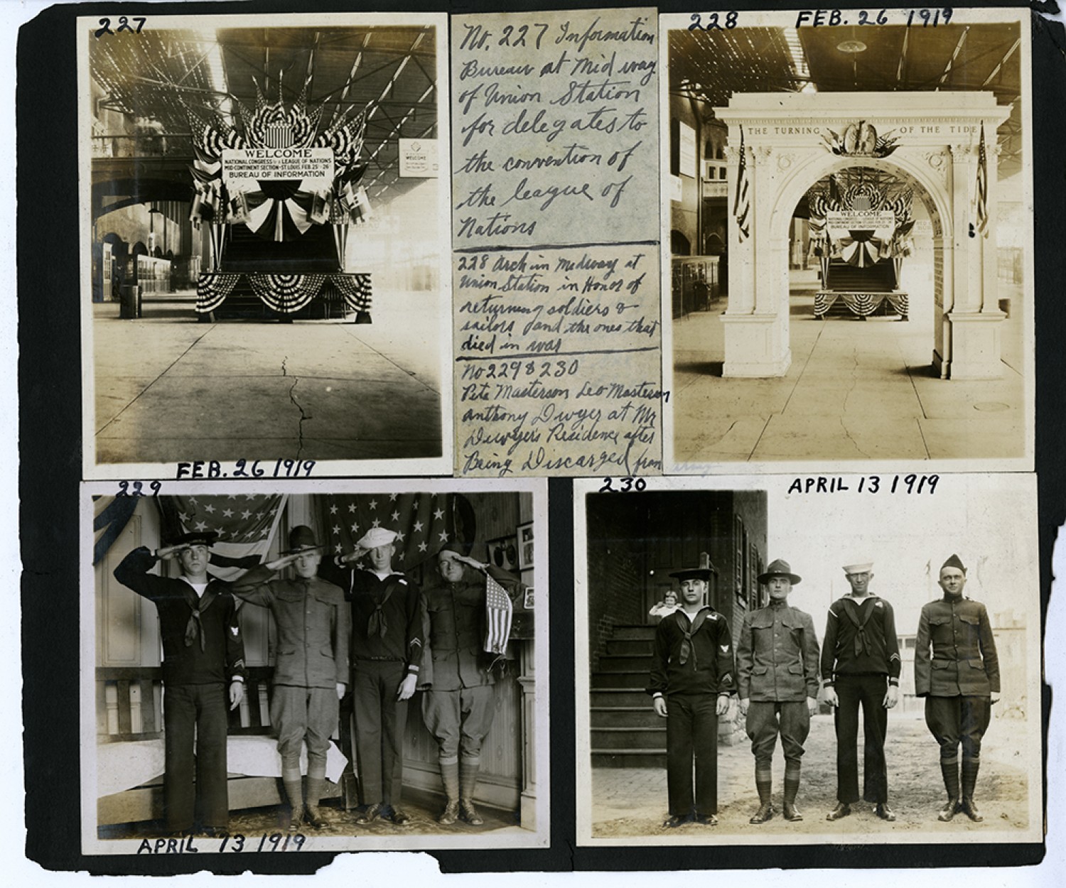 No. 227 Information Bureau at Mid way of Union Station for delegates to the convention of the league of Nations 228 Arch in Midway at Union Station in Honor of returning soldiers & sailors and the ones that died in war No 229 & 230 Pete Masterson Leo Masterson Anthony Dwyer at Mr. Dwyer’s Residence after Being Discarged from