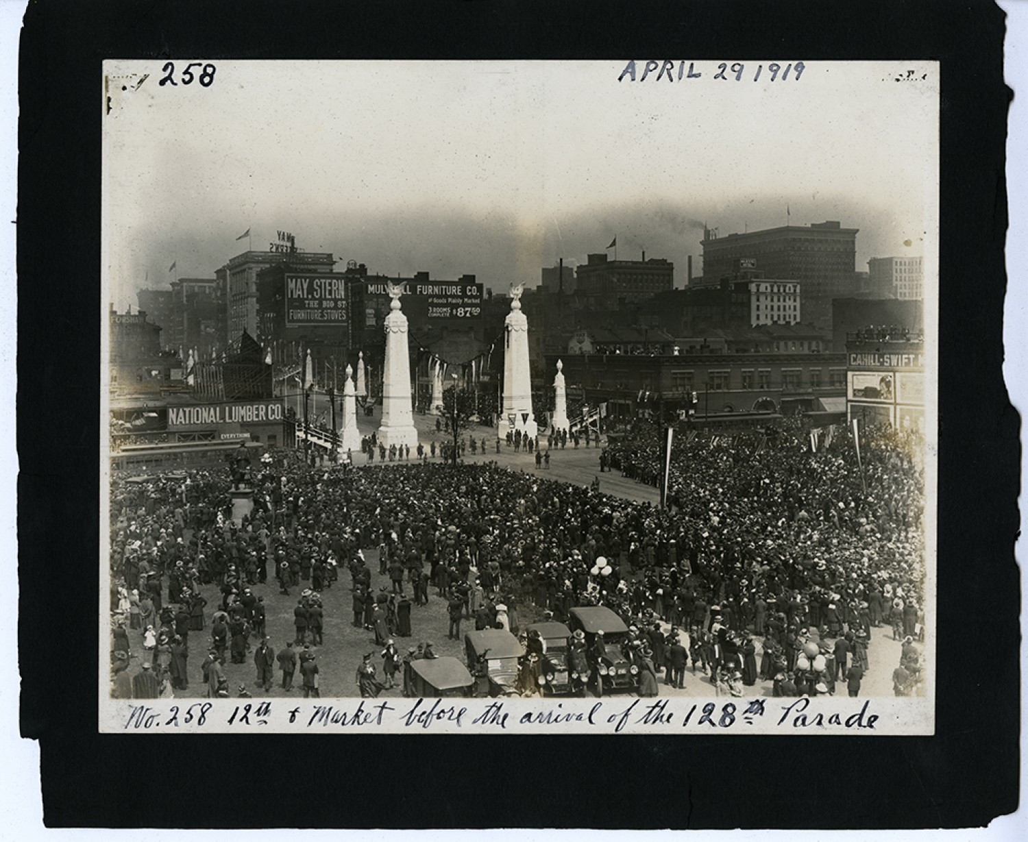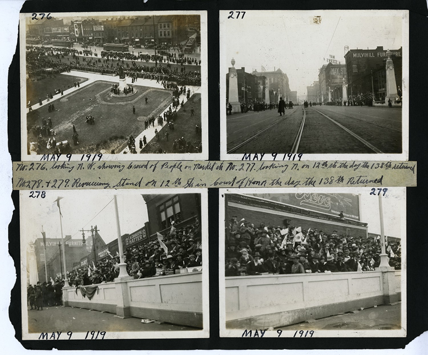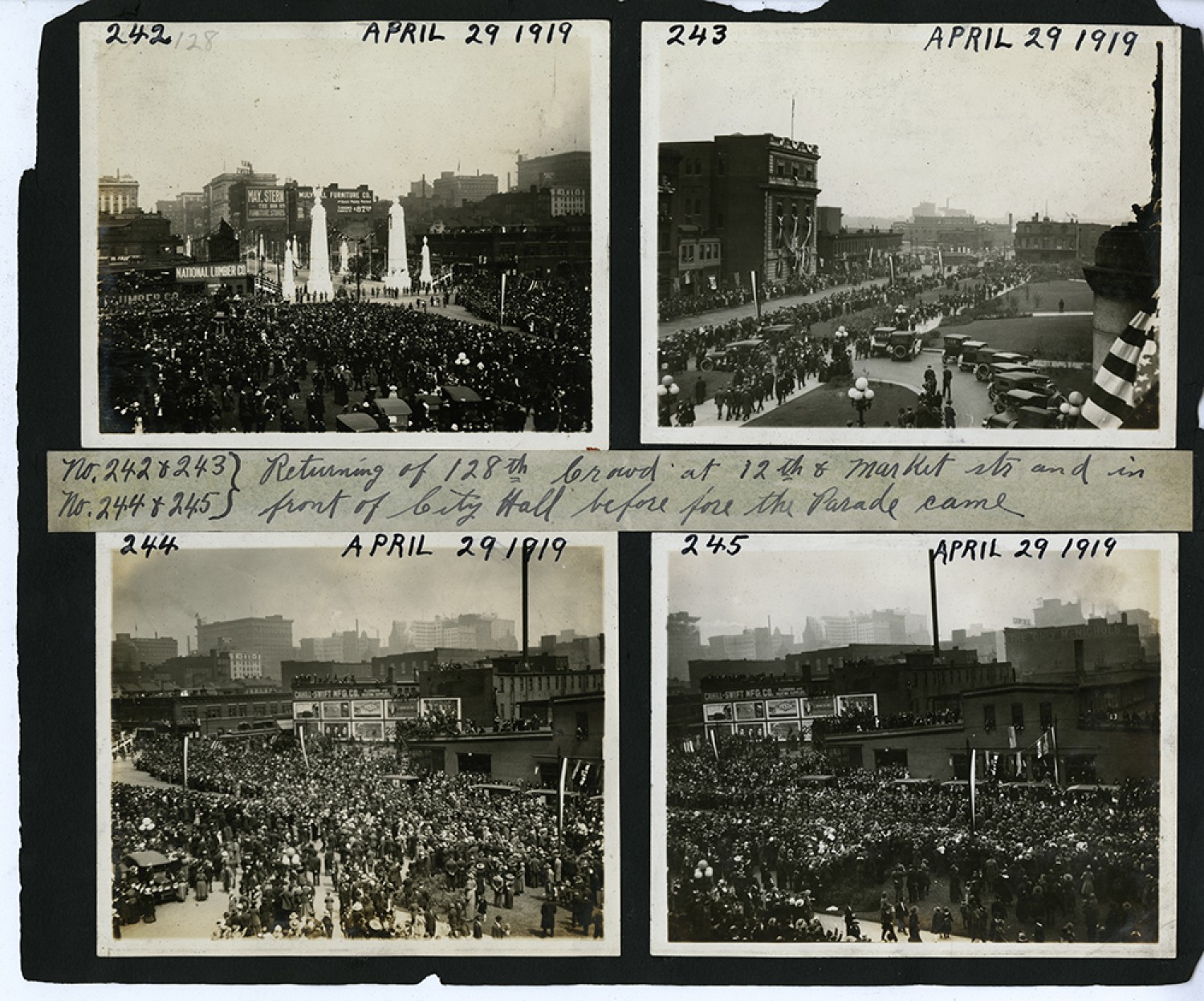 No. 276. Looking N.W. showing Crowd of People on Market str No. 277. Looking N. on 12th str the day the 128th returned No. 278 & 279. Reviewing Stand on 12th str in court of Honor the day the 128th Returned