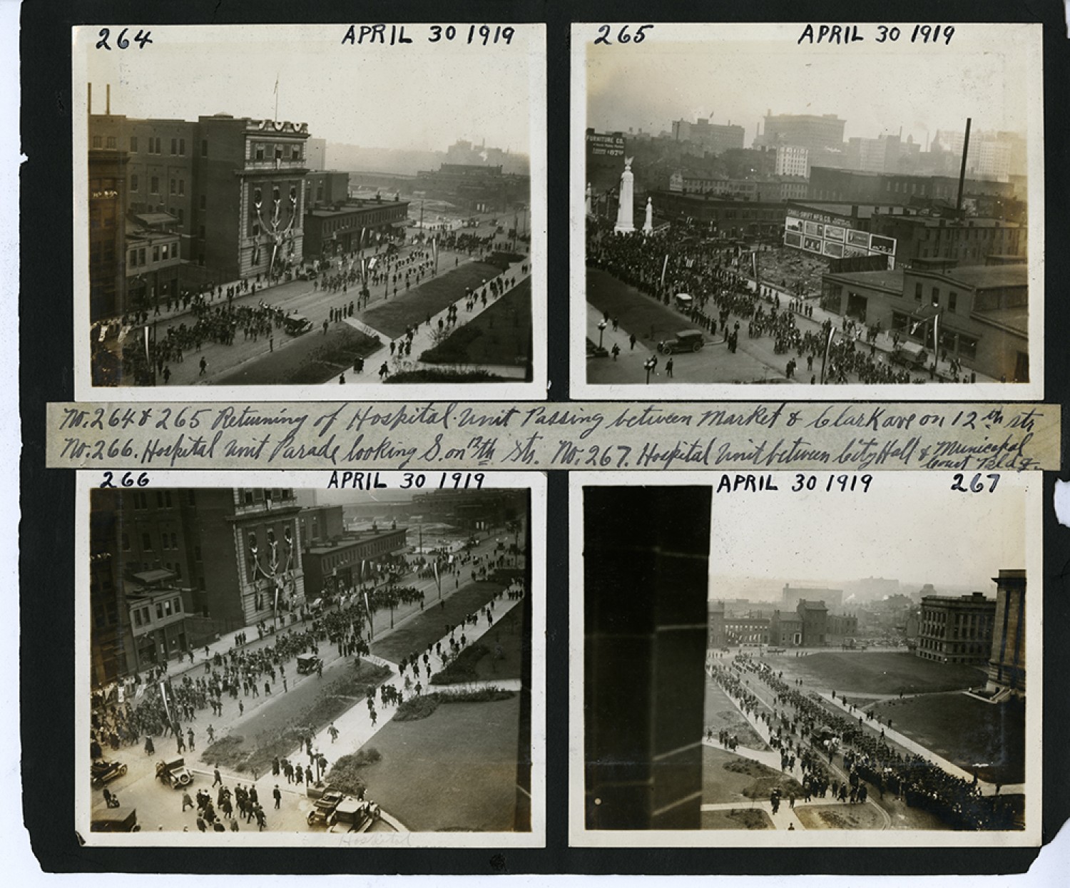 No. 264 & 265 Returning of Hospital unit Passing between Market & Clark ave on 12th str No. 266. Hospital unit Parade looking S. on 12th Str. No. 267. Hospital Unit between City Hall & Municipal Court Bldg.