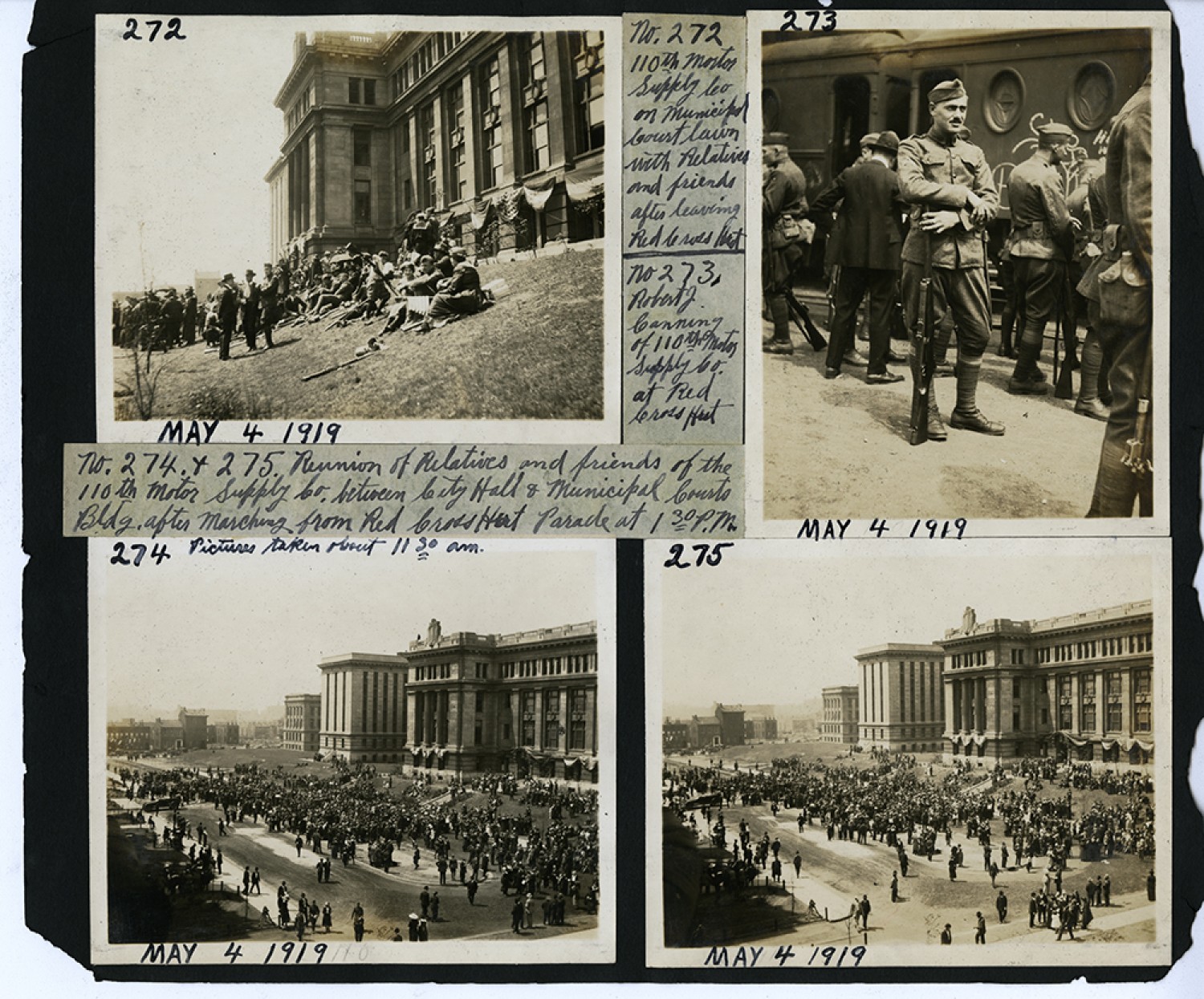 No. 272 110th Motor Supply Co on Municipal Court lawn with Relations and friends after leaving Red Cross hut No 273. Robert J Canning of 110th Motor Supply Co. at Red Cross Hut No. 274. & 275. Reunion of Relations and friends of the 110th Motor Supply Co. between City Hall & Municipal Courts Bldg. after marching from Red Cross Hut Parade at 1:30 P.M.