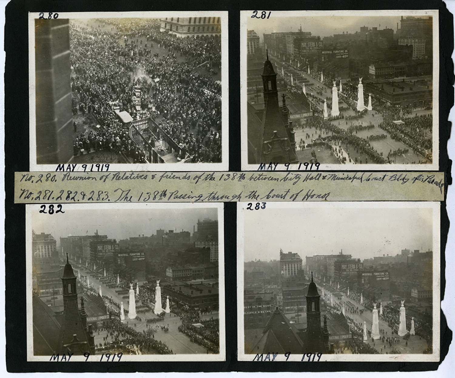 No. 280. Reunion of Relatives & friends of the 138th between City Hall & Municipal Court Bldg after Parade No. 281. 282. & 283. The 138th Passing through the court of Honor