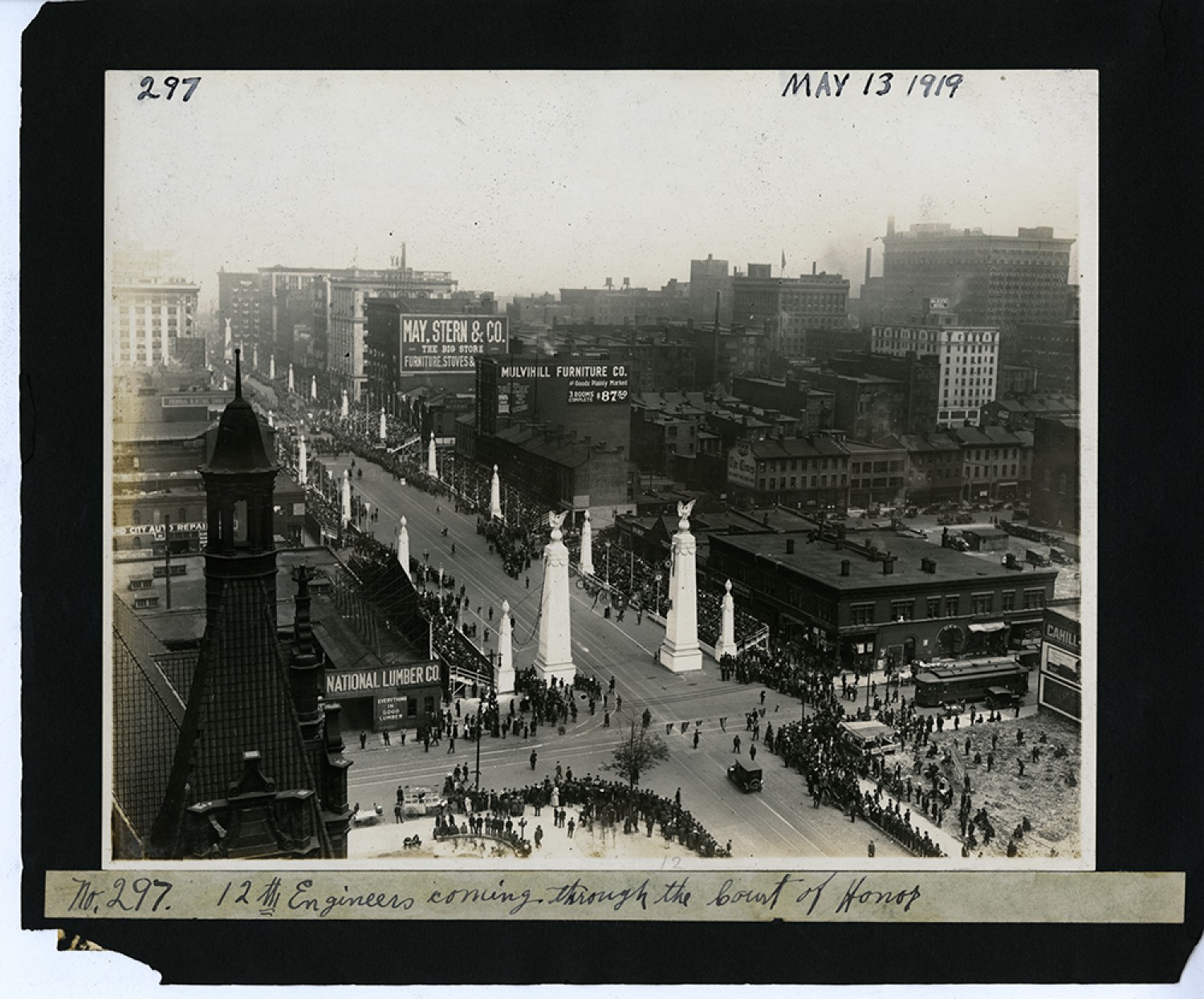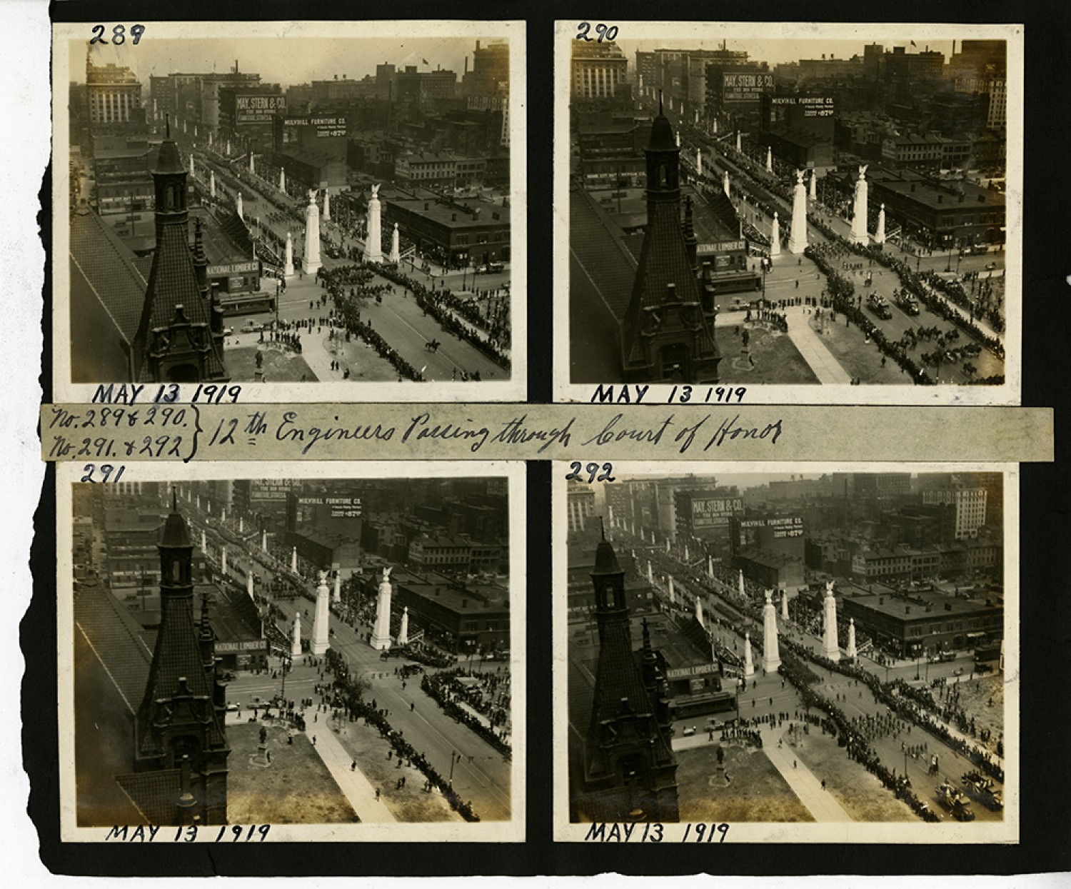 No. 180 Gun captured by 35th Div. in argonne Forest at 12th & market str. No 182 Sailors & G.A.R. in Court of Honor the day the 89th returned No. 181 Armistice day truck load of negro’s at 19th & market str. N.E. cor. Picture taken 1:35 P.M. No. 183 G.A.R. passing through court of Honor the day that the 89th returned