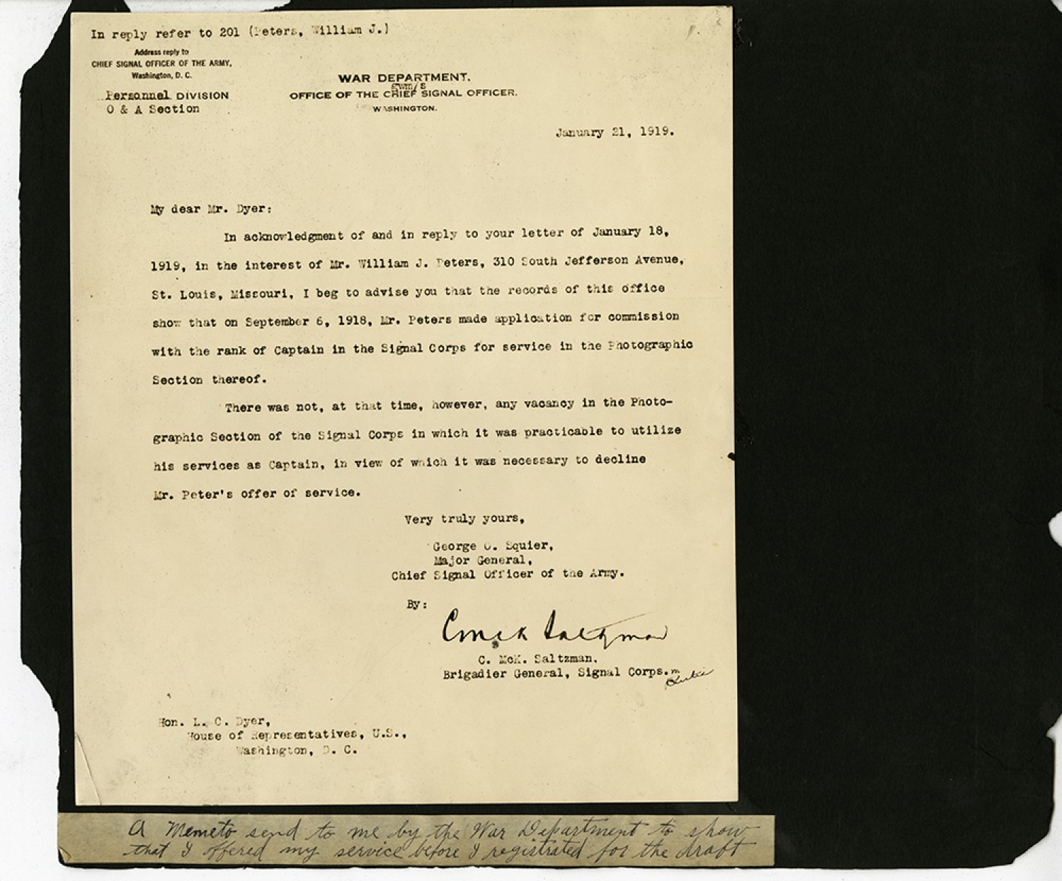 January 21, 1919 My dear Mr. Dyer: In acknowledgement of and in reply to your letter of January 18, 1919, in the interest of Mr. William J. Peters, 310 South Jefferson Avenue, St. Louis, Missouri, I beg to advise you that the records of this office show that on September 6, 1918, Mr. Peters made application for commission with the rank of Captain in the Signal Corps for service in the Photographic Section thereof. There was not, at that time, however, any vacancy in the Photographic Section of the Signal Corps in which it was practicable to utilize his services as Captain, in view of which it was necessary to decline Mr. Peter’s offer of service. Very truly yours, George C. Squier, Major General, Chief Signal Officer of the Army. By: C. Mck. Saltzman, Brigadier General, Signal Corps. Hon. L.C. Dyer, House of Representatives, U.S., Washington, D.C. A Memeto send to me by the War Department to show that I offered my service before I registrated for the draft