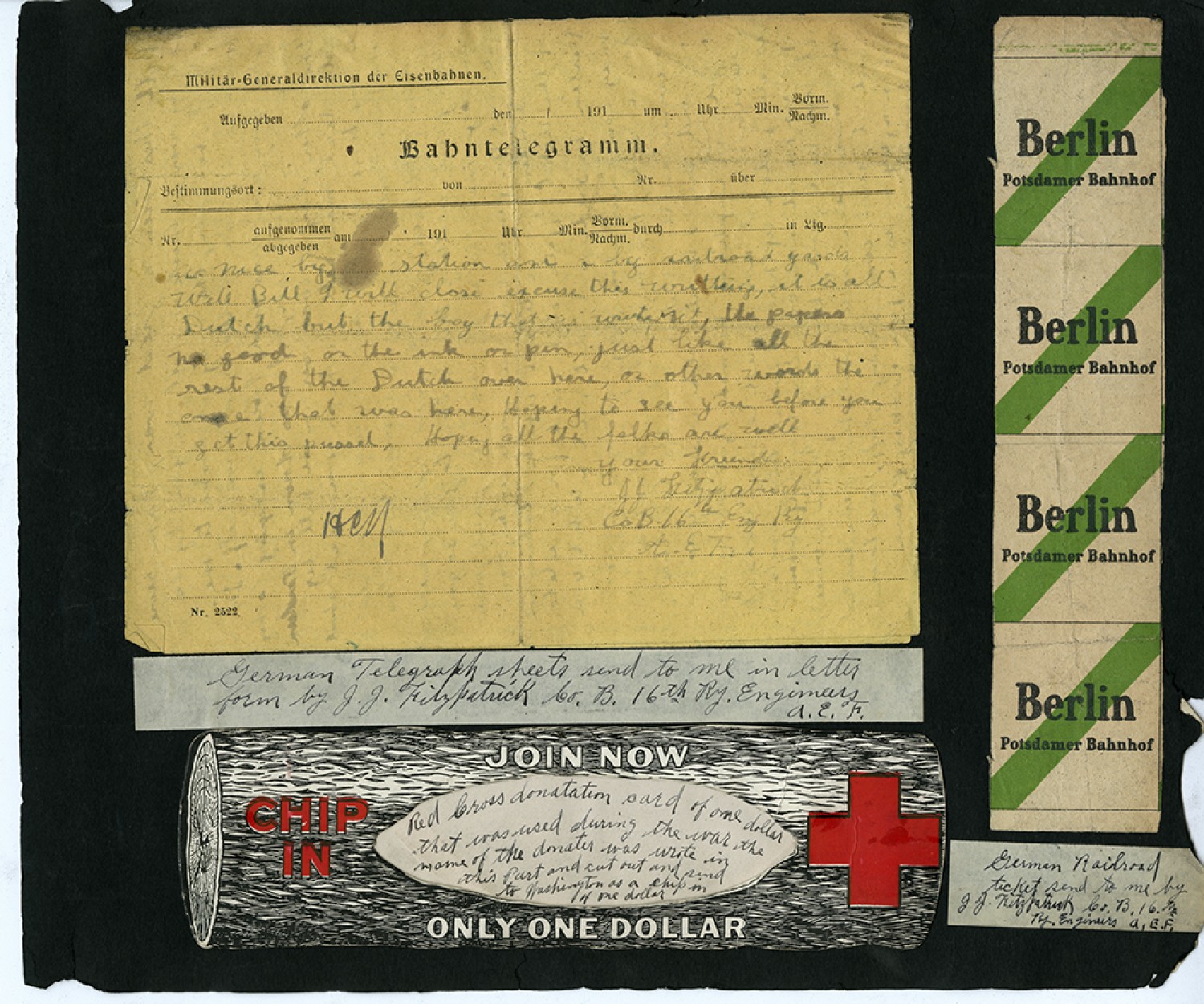 nice by station one by railroad yards Well Bill I will close excuse tis writing, it is all Dutch but the boy that is writing it, the paper no good or the ink or pen, just like all the rest of the Dutch over here, or other words the one that was here, Hoping to see you before you get the passel, Hoping all the folks are well your Friend JJ Fitzpatrick Co B 16th Eng Rg A.E.F. German Telegraph sheets send to me in letter form by J.J. Fitzpatrick Co. B. 16th Rg. Engineers A.E.F. Red Cross donation card of one dollar that was used during the war the name of the donater was wrote in the part and cut out and send to Washington as a chip in 4 one dollar German Railroad ticket send to me by J.J. Fitzpatrick Co. B. 16th Rg. Engineers A.E.F.