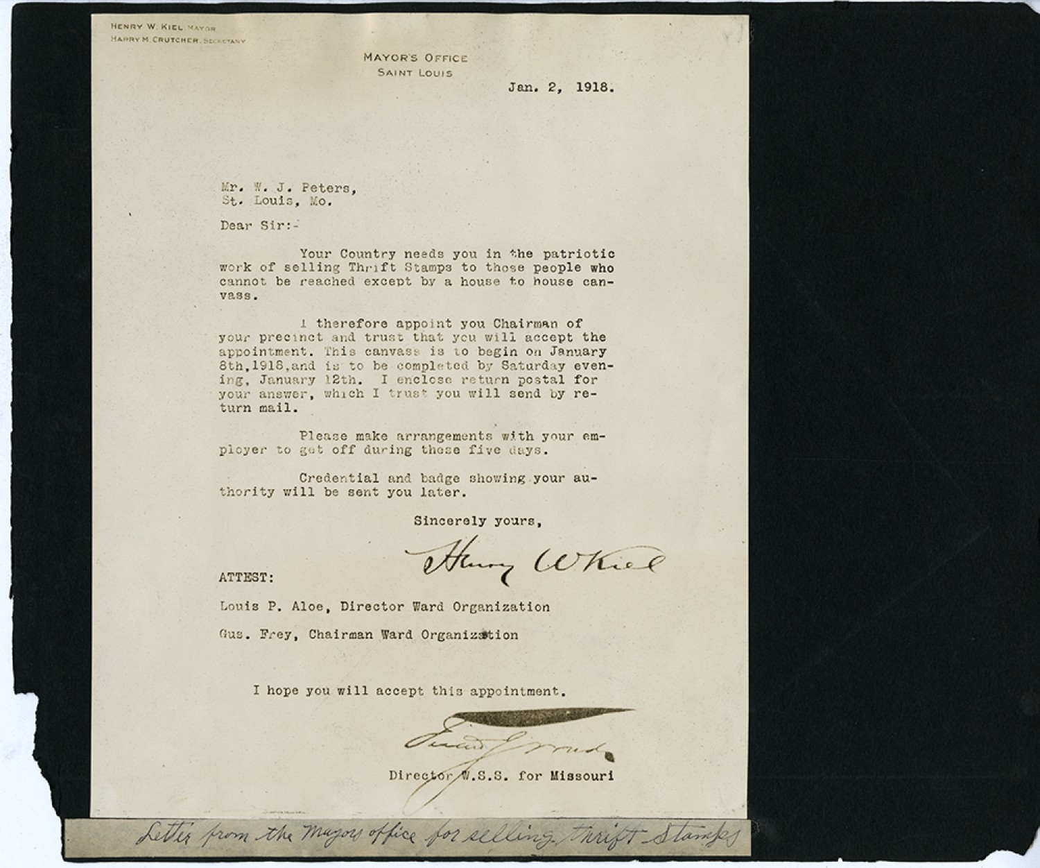 [January] 2, 1918. Mr. W.J. Peters, St. Louis, [Missouri] Dear Sir:- Your Country needs you in the patriotic work of selling Thrift Stamps to those people who cannot be reached except by a house to house canvass. I therefore appoint you Chairman of your precinct and trust that you will accept the appointment. This canvass is to begin on January 8th, 1918, and is to be completed by Saturday evening, January 12th. I enclose return postal for your answer, which I trust you will send by return mail. Please make arrangements with your employer to get off during these five days. Credential and bade showing your authority will be sent you later. Sincerely yours, Henry W Kiel ATTEST: Louis P. Aloe, Director War Organization Gus. Frey, Chairman Ward Organization I hope you will accept this appointment. [ms illegible: 2wds] Director W.S.S. for Missouri Letter from the Mayors office for selling thrift stamps.
