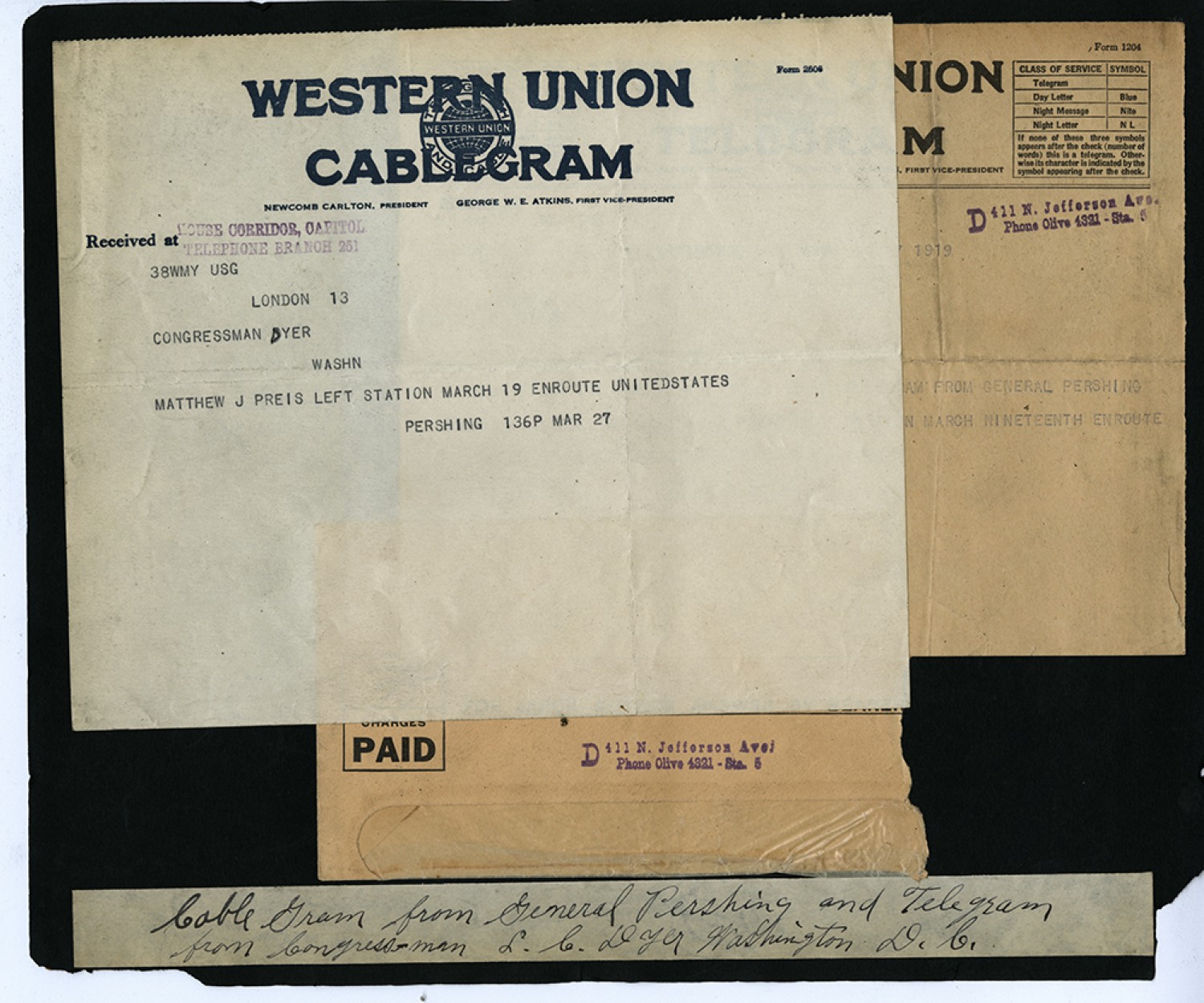 H B WASHINGTON D C 318P MAR 27 1919 MR WM J PETERS 310 S JEFFERSON AVE ST LOUIS MO AM GLAD TO ADVISE YOU THAT I RECEIVED A CABLEGRAM FROM GENERAL PERSHING WHIH IS AS FOLLOWS MATTHEW J PREIS LEFT STATION MARCH NINETEENTH ENROUTE TO UNITED STATES AM MAILING CABLEGRAM TO OU L C DYER 304P Cable Gram from General [John] Pershing and Telegram from Congressman L.C. Dyer Washington D.C.