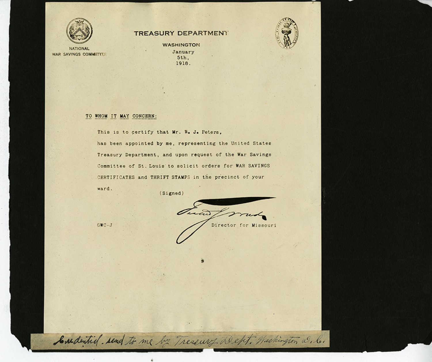 TO WHOM IT MAY CONCERN: This is to certify that Mr. W.J. Peters, has been appointed by me, representing the United State Treasury Department, and upon request of the War Savings Committee of St. Louis to solicit orders for WAR SAVINGS CERTIFICATES and THRIFT STAMS in the precinct of your ward (signed) [ms illegible: 2 wds] Director for Missouri Credential send to me by Treasury Dept. Washington D.C.