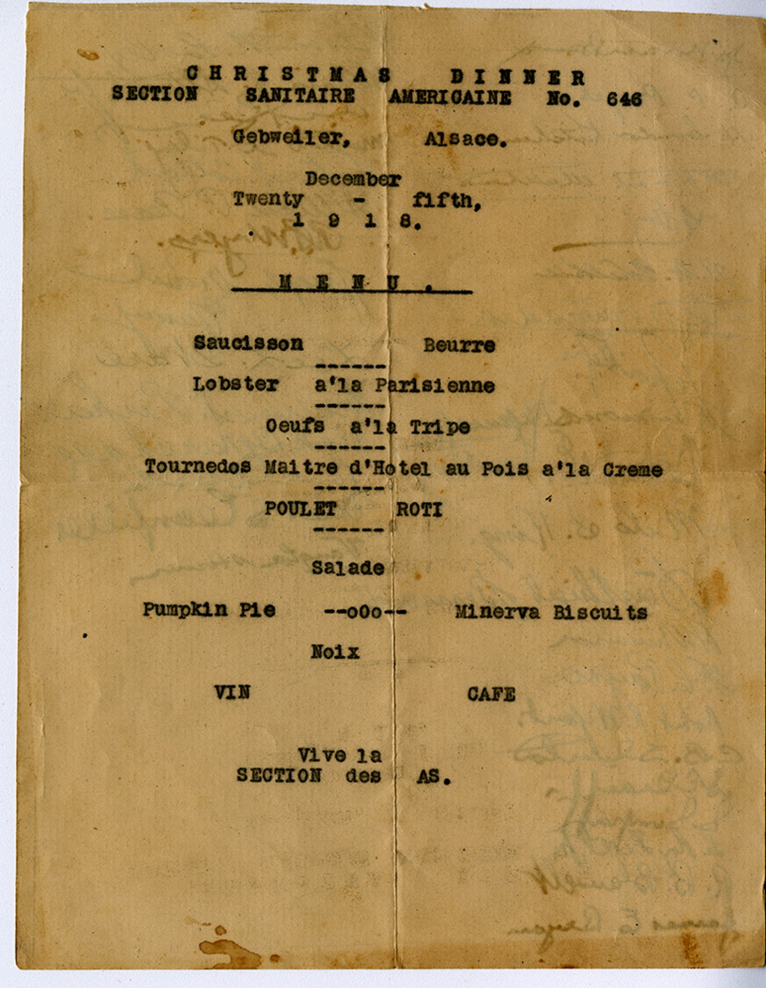 CHRISMAS DINNER SECTION SANITAIRE AMERIGAINE NO. 646 Gebweller, Alsace. December Twenty – fifth, 1918 MENU Saucisson Beure _____ Lobster a’la Pasrisienne_____ Oeufs a’la Tripe_____ Tournedos Maite d’Hotel au Pois a’la Creme _____ POULET ROTI _____ Salade Pumpkin Pie __oOo__ Minerva Biscuits Noix VIN CAFE Vive la AECTION des AS.