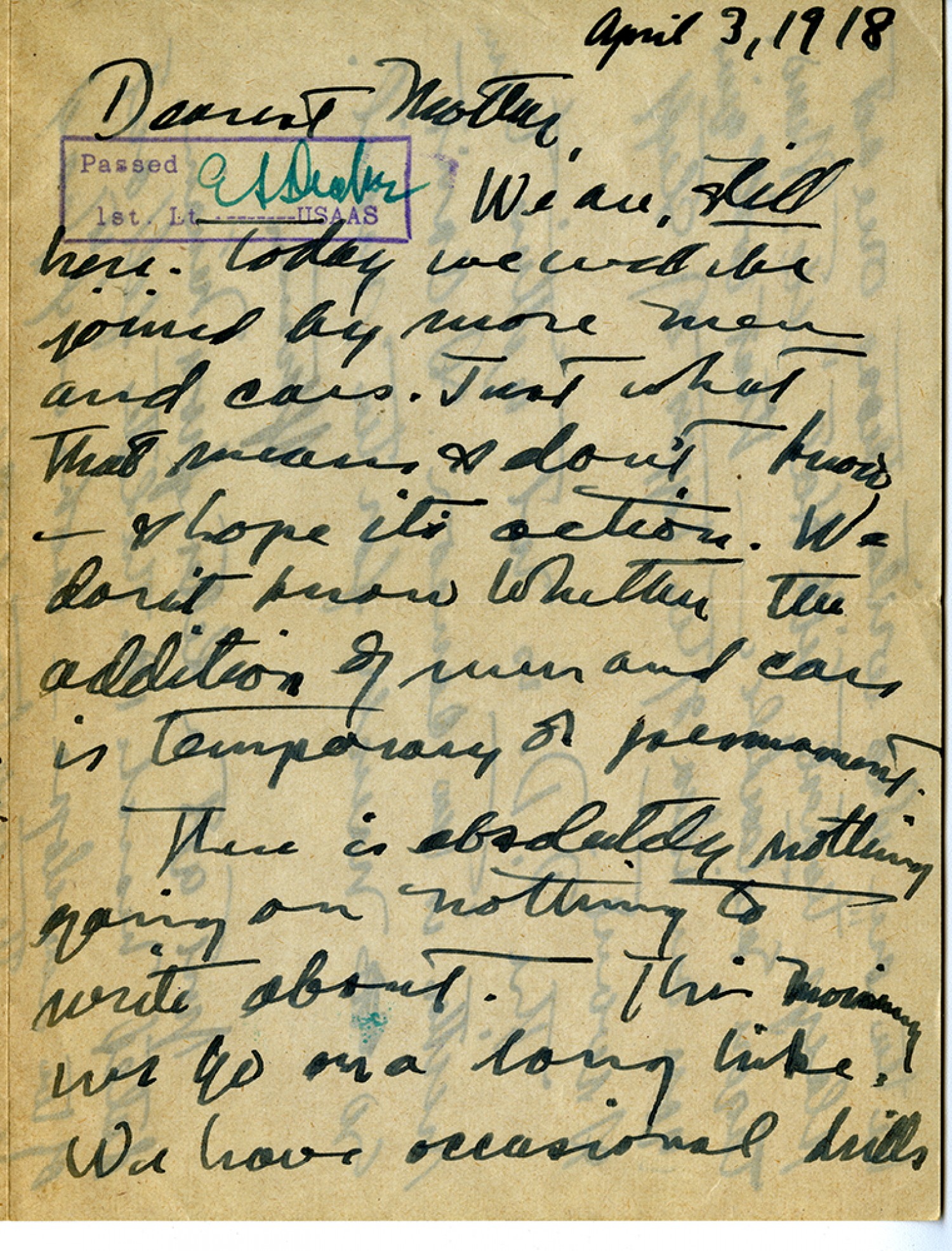 April 3, 1918 Dearest Mother, [censor’s stamp] We are still here. Today we will be joined by more men and cars. Just what that means I don't know I hope it's action. We don't know whether the addition of men and cars is temporary or permanent. There is absolutely nothing going on nothing to write about. This morning we go on a long hike. We have occasional drills