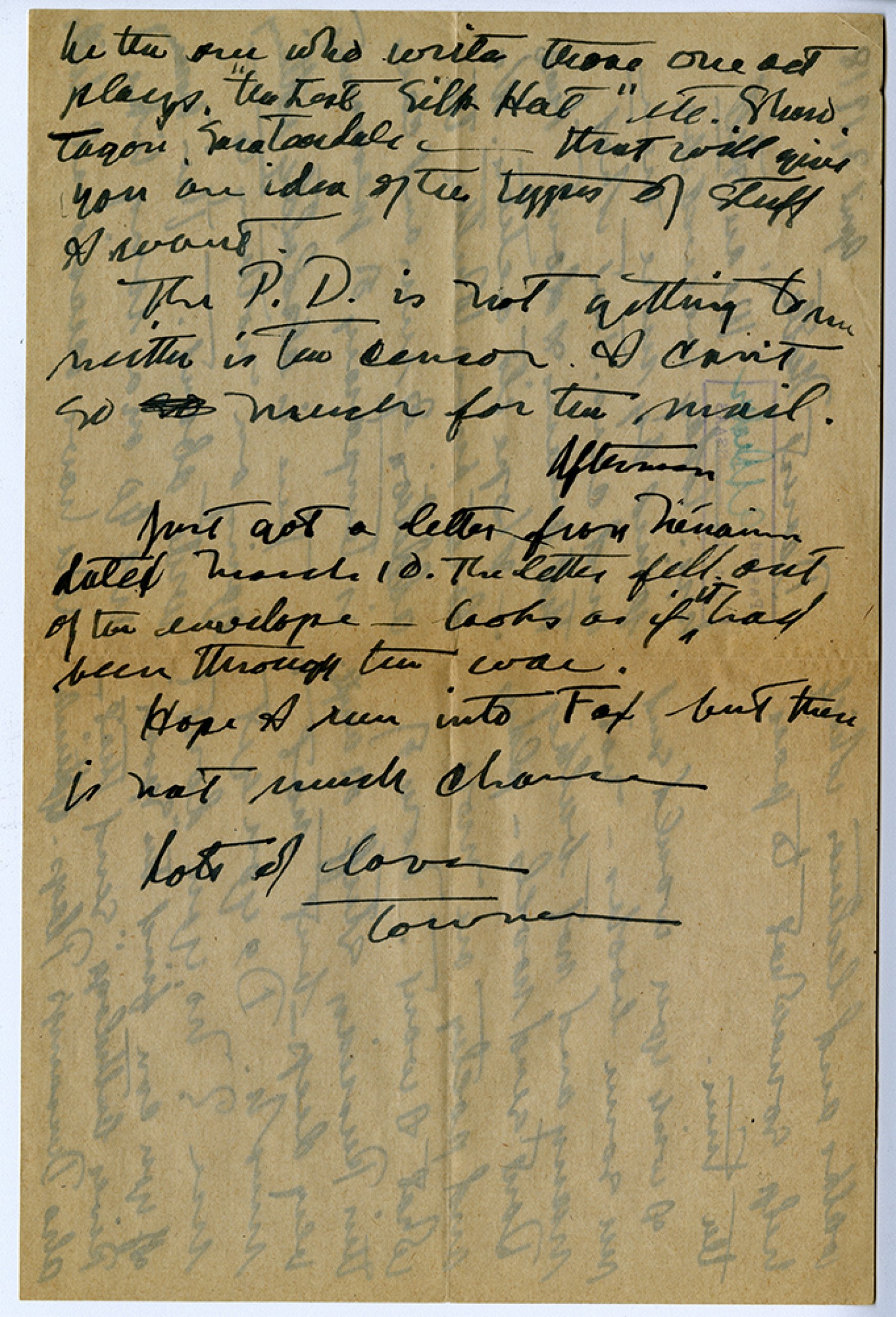 I think he's the one who writes those one act plays, "The Lost Silk Hat" etc., Shaw, Tagore, Sara Teasdale that will give you an idea of the types of stuff I want. The [St. Louis Post Dispatch] is not getting to me neither is the censor. I can't so much for the mail. Afternoon Just got a letter from Nenaine dated March 10. The letter fell out of the envelope looks as if it had been through the war. Hope I run into Fax but there is not much chance. Lots of love, Towner