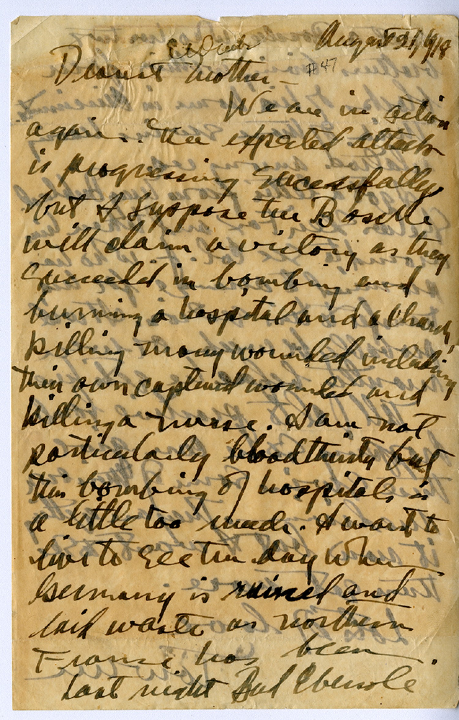 August 21, 1918 Dearest Mother, We are in action again. The expected attack is progressing successfully but I suppose the Bosche will claim a victory as they succeeded in bombing and burning a hospital and a church killing many wounded including their own captured wounded and killing a nurse. I am not particularly bloodthirsty but the bombing of hospitals is a little too much. I want to live to see the day when Germany is ruined and laid waste as Northern France has been. Last night Bud Ebersole