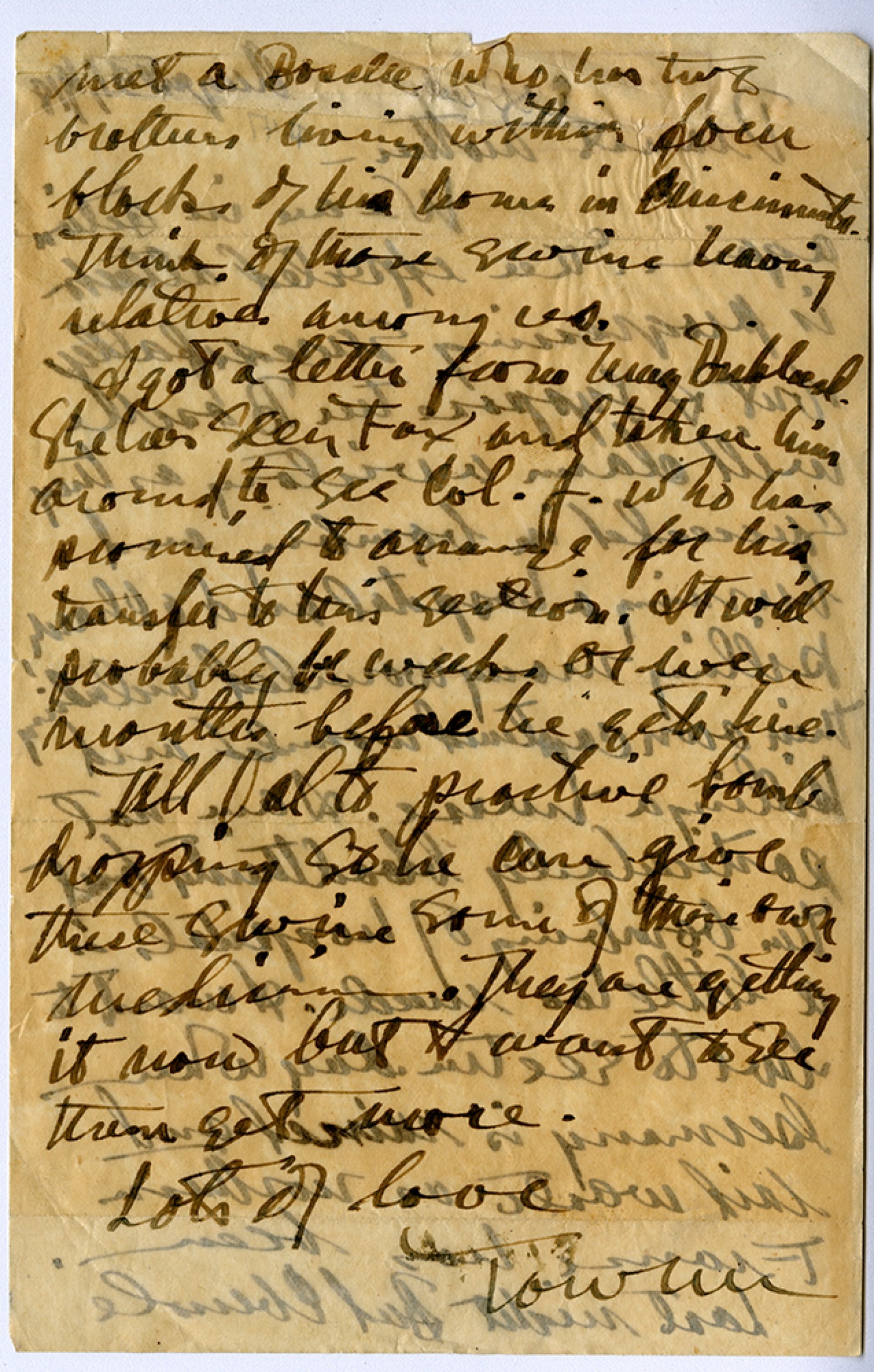 met a Bosche who has two brothers living within four blocks of his home in Cincinnati. Think of those swine having relatives among us. I got a letter from May Birkhead. She has seen Fax and taken him around to see Colonel J. who has promised to arrange for his transfer to this section. It will probably be weeks or even months before he gets here. Tell Val to practice bomb dropping so he can give these swine some of their own medicine. They are getting it now but I want to see them get more. Lots of love, Towner
