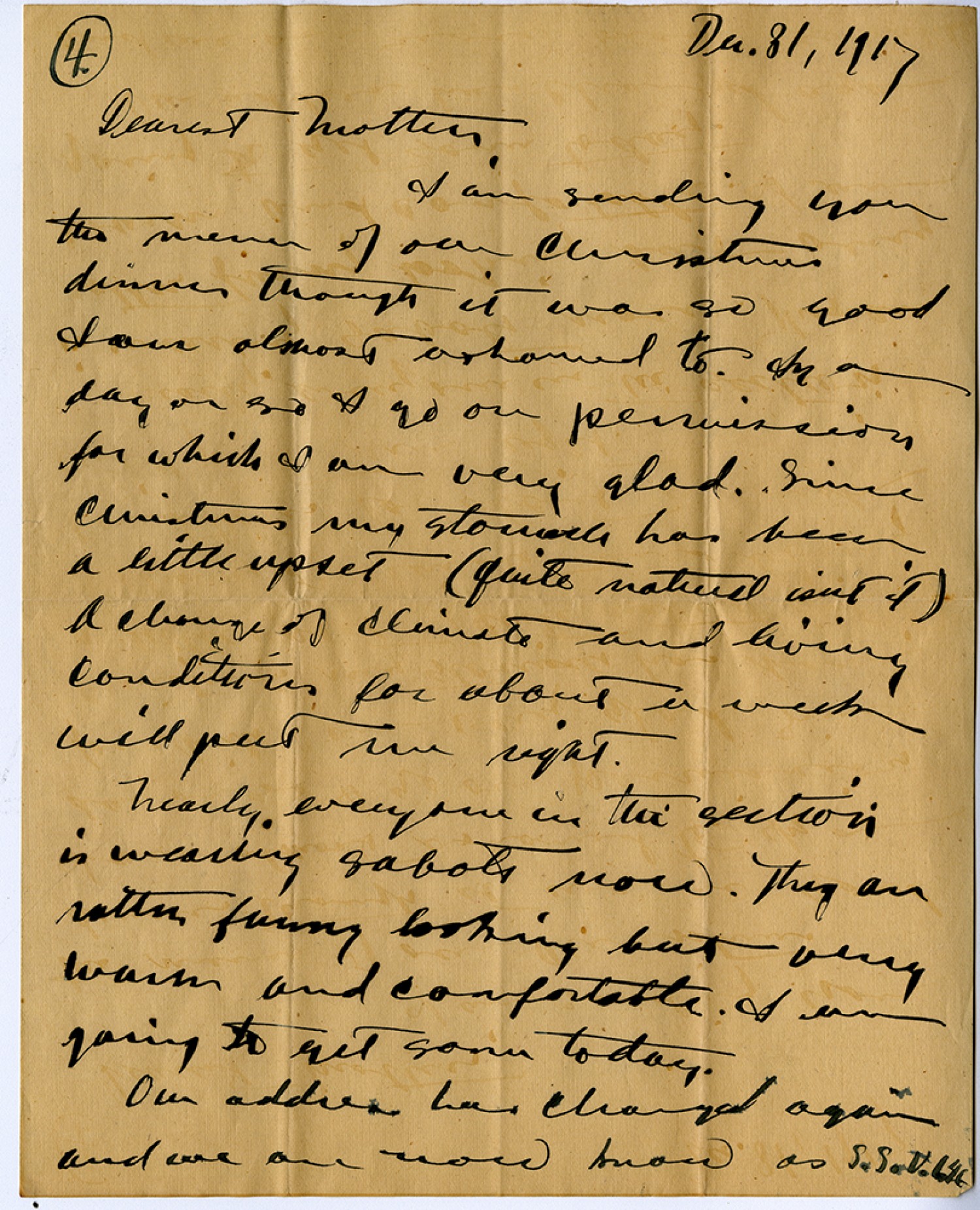 4. [December] 31, 1917 Dearest Mother, I am sending you the menu of our Christmas dinner though it was so good I am almost ashamed to. In a day or so I go on permission for which I am very glad. Since Christmas my stomach has been a little upset (quite natural isn't it). A change of climate and living conditions for about a week will put me right. Nearly everyone in the section is wearing sabots now. They are rather funny looking but very warm and comfortable. I am going to get some today. Our address has changed again and we are now known as S.S.U. 646