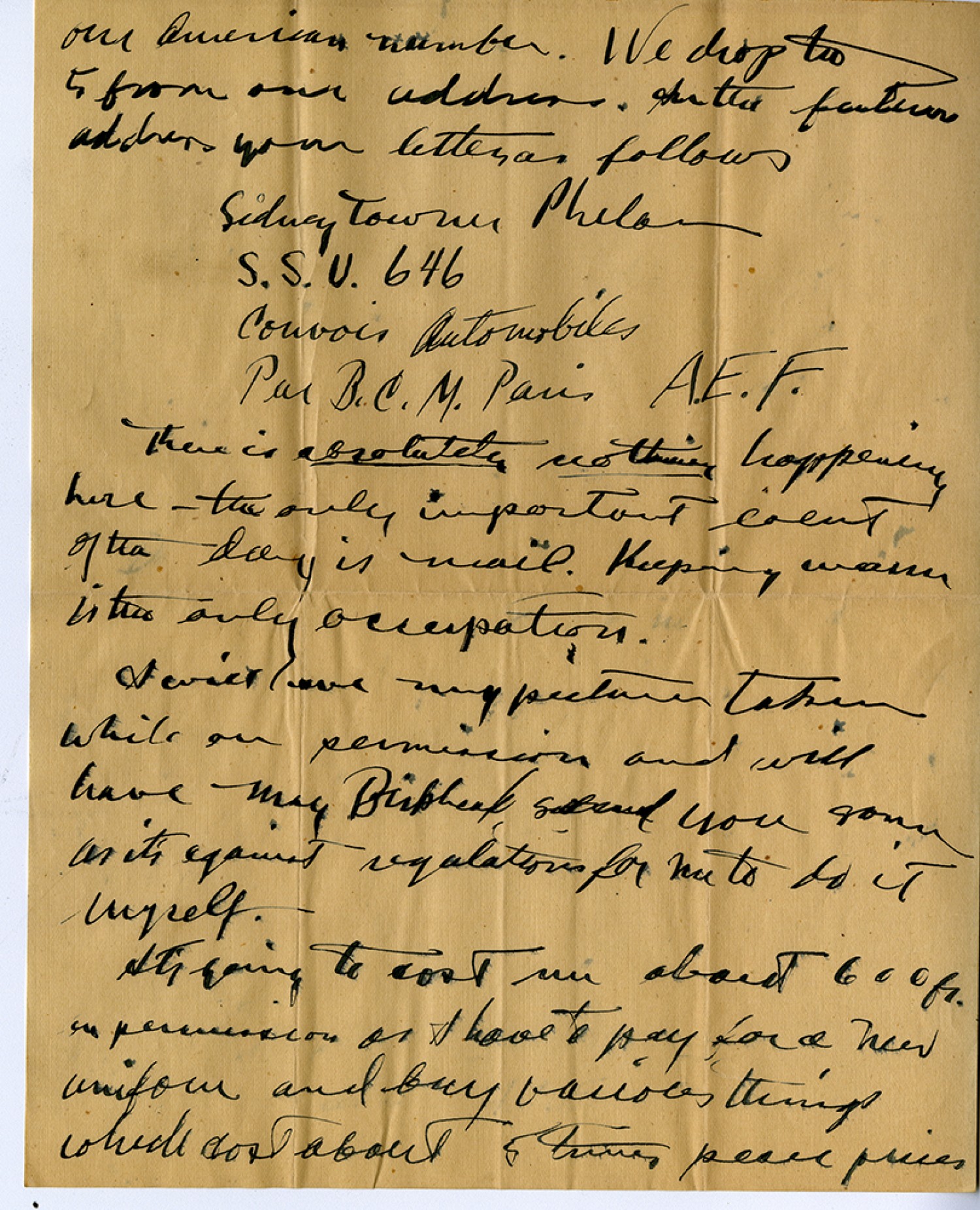our American number. We drop the 5 from our address. In the future address your letters as follows Sidney Towner Phelan S.S.U. 646 Convois Automobiles Par B.C.M. Paris A.E.F. There is absolutely nothing happening here the only important event of the day is mail. Keeping warm is the only occupation. I will have my picture taken while on permission and will have May Birkhead send you some as it's against regulations for me to do it myself. It's going to cost me about 600 francs on permission as I have to pay for a new uniform and buy various things which cost about 5 times peace prices