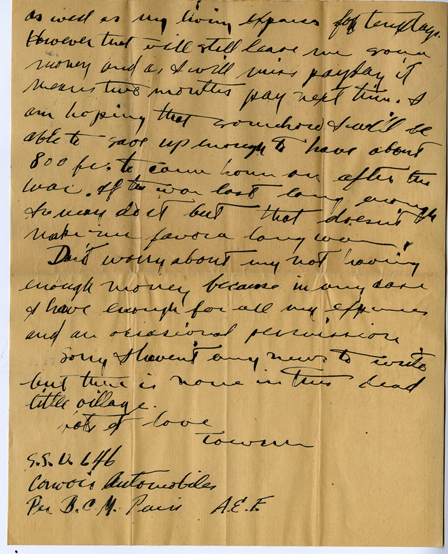 as well as my living expenses for ten days. However that will still leave me some money and as I will miss payday it means two month's pay next time. I am hoping that somehow I will be able to save up enough to have about 800 fr. to come home on after the war. If the war lasts long enough I may do it but that doesn't make me favor a long war. Don't worry about my not having enough money because in my case I have enough for all mu expenses and an occasional permission. Sorry I haven't any news to write but there is none in the dead little village. Lots of love, Towner S.S. U. 646 Corvois Automobile Par B.C.M. Paris A.E.F.