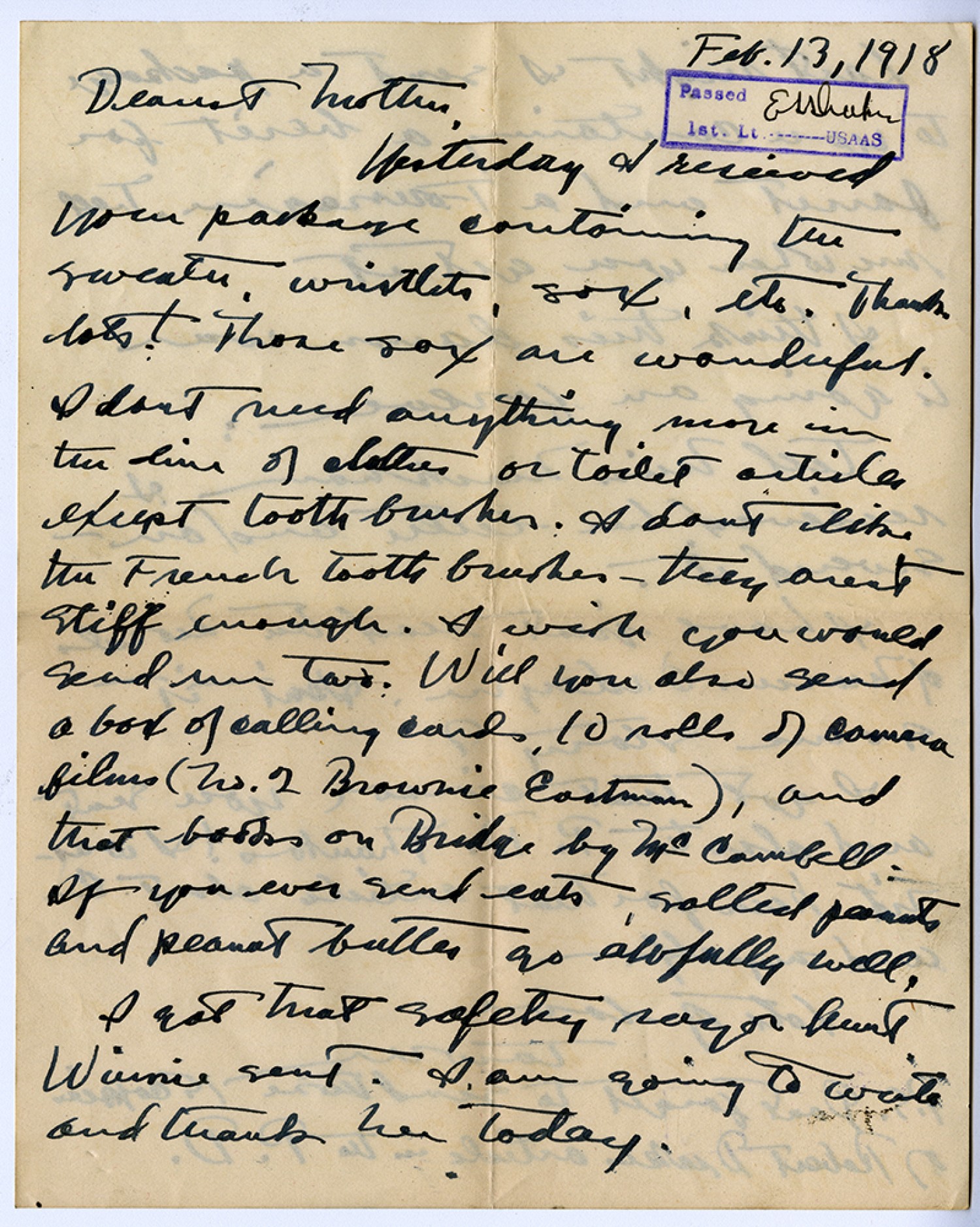 [February] 13, 1918 [censor’s stamp] Dearest Mother, Yesterday I received your package containing the sweater, wristlets, sox, etc. Thanks lots! Those sox are wonderful. I don’t need anything more in line of clothes or toilet articles except toothbrushes. I don’t like the French tooth brushes---they aren’t stiff enough. I wish you would send me two. Will you also send a box of calling cards, 10 rolls of camera films (No.2 Brownie Eastman), and that book on Bridge by McCampbell. If you ever send eats, salted peanuts and peanut butter go awfully well. I got that safety razor Aunt Winnie sent. I am going to write and thank her today.