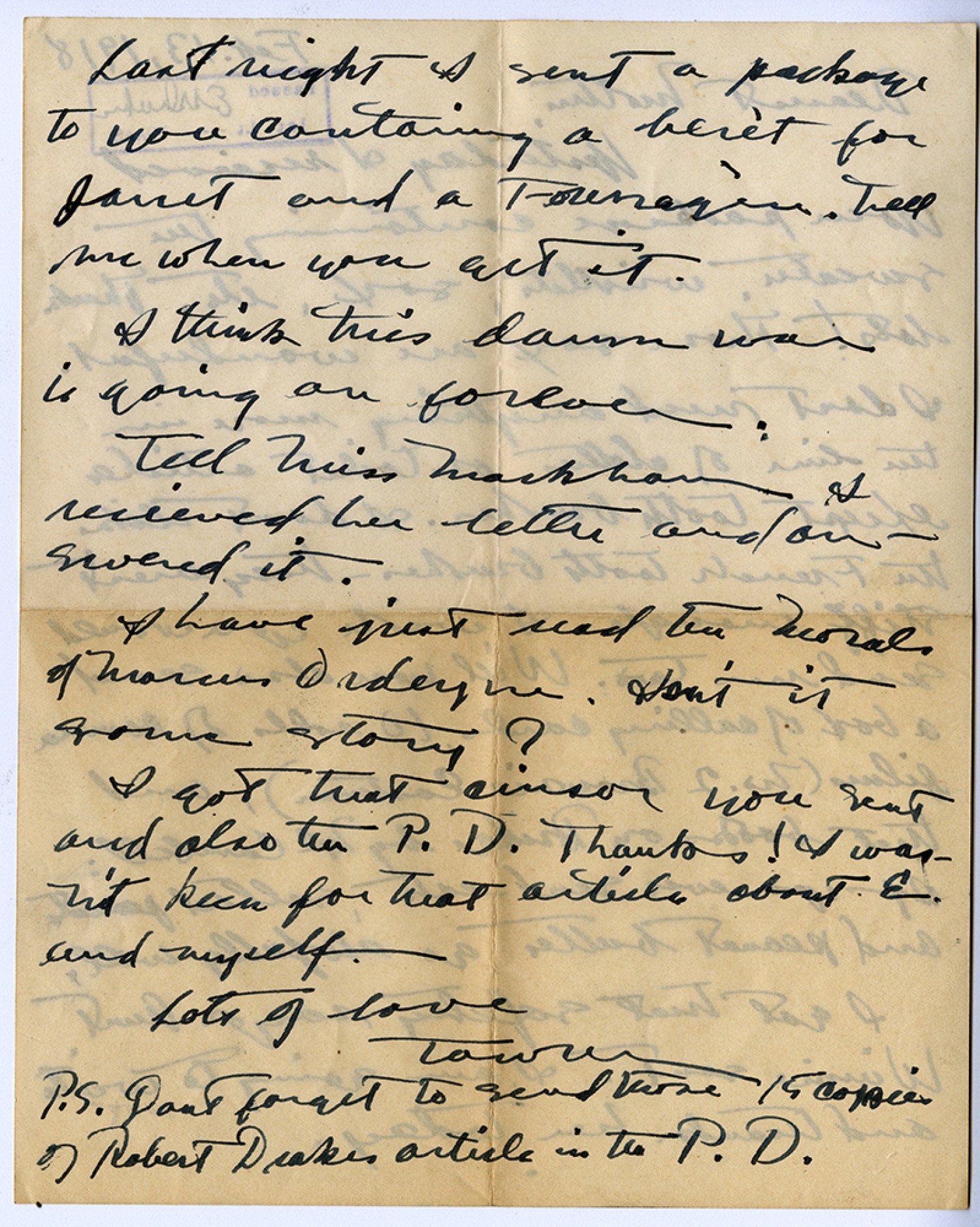 Last night I sent a package to you containing a beret for Janet and a Fourragere. Tell me when you get it. I think this damn war is going on forever. Tell Miss Markham I received her letter and answered it. I have just read the Morals of Marcus Ordeyne. Isn’t it some story? I got that [ms illegible: 1 wd] you sent and also the [St. Louis Post Dispatch] Thanks! I wasn’t keen for that article about E. and myself. Lots of love, Towner P.S. Don’t forget to send those 15 copies of Robert Drakes article in the [St. Louis Post Dispatch]