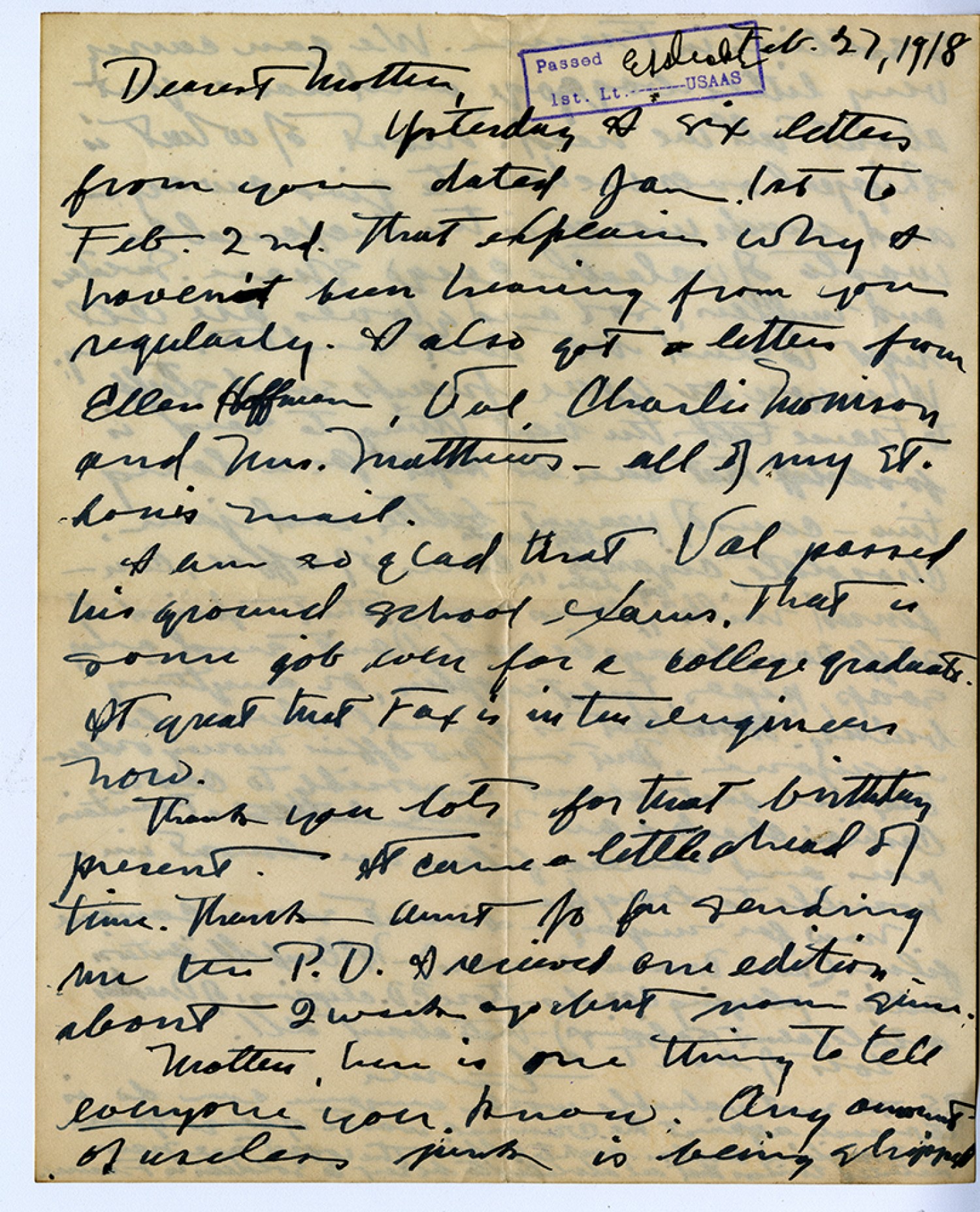 [February] 27, 1918 [censor’s stamp] Dearest Mother, Yesterday I six letters from you dated [January] 1st to [February] 2nd. That explains why I haven’t been hearing from you regularly. I also got letters from Ellen Hoffman, Val, Charlie Morrison and Mrs. Matthews---all of my St. Louis mail. I am so glad that Val passed his ground school exams. That is some job even for a college graduate. It’s great that Fax is in the engineers now. Thank you lots for that birthday present. It came a little ahead of time. Thank Aunt Jo for sending me the [St. Louis Post Dispatch] I received one edition about 2 weeks ago but not since. Mother, here is one thing to tell everyone you know. Any amount of useless junk is being shipped