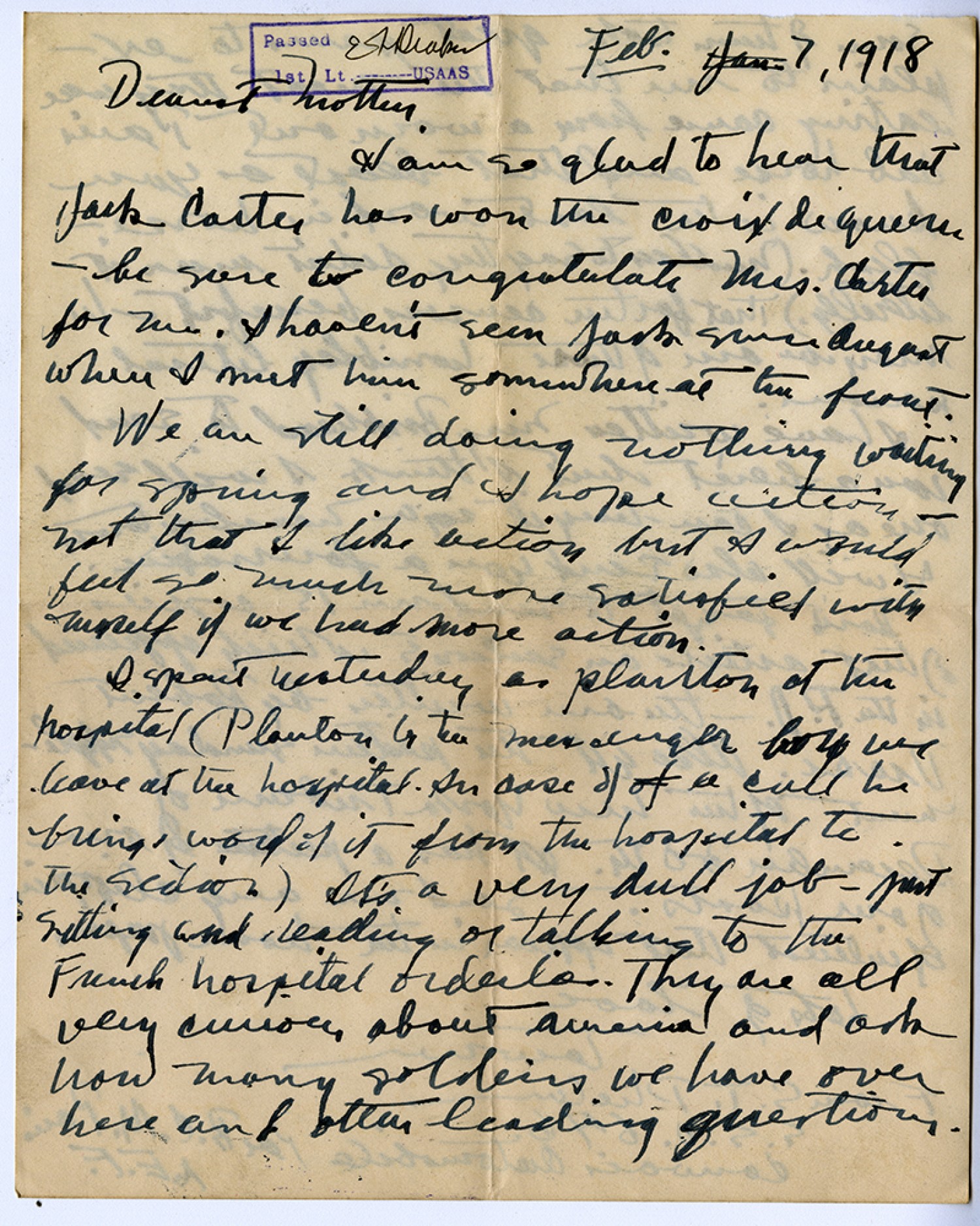 [February] 7, 1918 [censor’s stamp] Dearest Mother, I am so glad to hear that Jack Carter has won the Croix de Guerre be sure to congratulate Mrs. Carter for me. I haven't seen Jack since August when I met him somewhere at the front. We are still doing nothing waiting for spring and I hope action not that I like action but I would feel so much more satisfied with myself if we had more action. I spent yesterday as planton (Orderly, Ed.) at the hospital. (Planton is the messenger boy we have at the hospital. In case of a call he brings word of it from the hospital to the section).It's a very dull job just sitting and reading or talking to the French hospital orderlies. They are all very curious about America and ask how many soldiers we have over here and other leading questions.