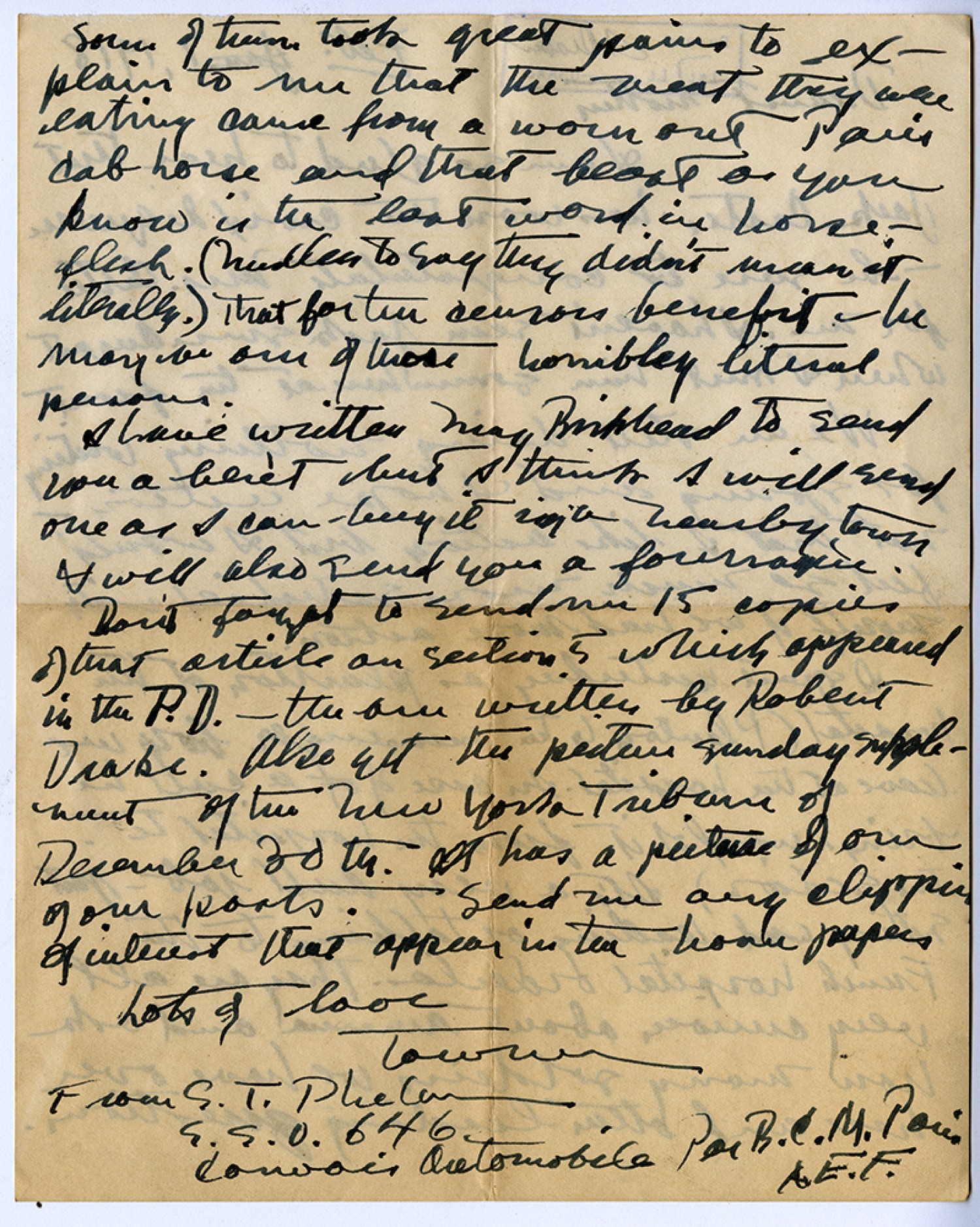 Some of them took great pains to explain that the meat they are eating came from a worn out Paris cab horse and that beast as you know is the last word in horse flesh. (needless to say they didn't mean it literally.) That for the censors benefit he may be one of those horribly literal persons. I have written May Birkhead to send you a beret but I think I will send one as I can buy it in a nearby town. I will also send you a fourragere. Don't forget to send me 15 copies of that article on Section 5 which appeared in the P.D. the one written by Robert Drake. Also get the picture Sunday supplement of the New York Tribune of December 30th. It has a picture of our posts. Send me any clippings or interest that appear in the home papers. Lots of love Towner From S.T. Phelan S.S.U. 646 Convois Automobile Par B.C.M. Paris A.E.F.