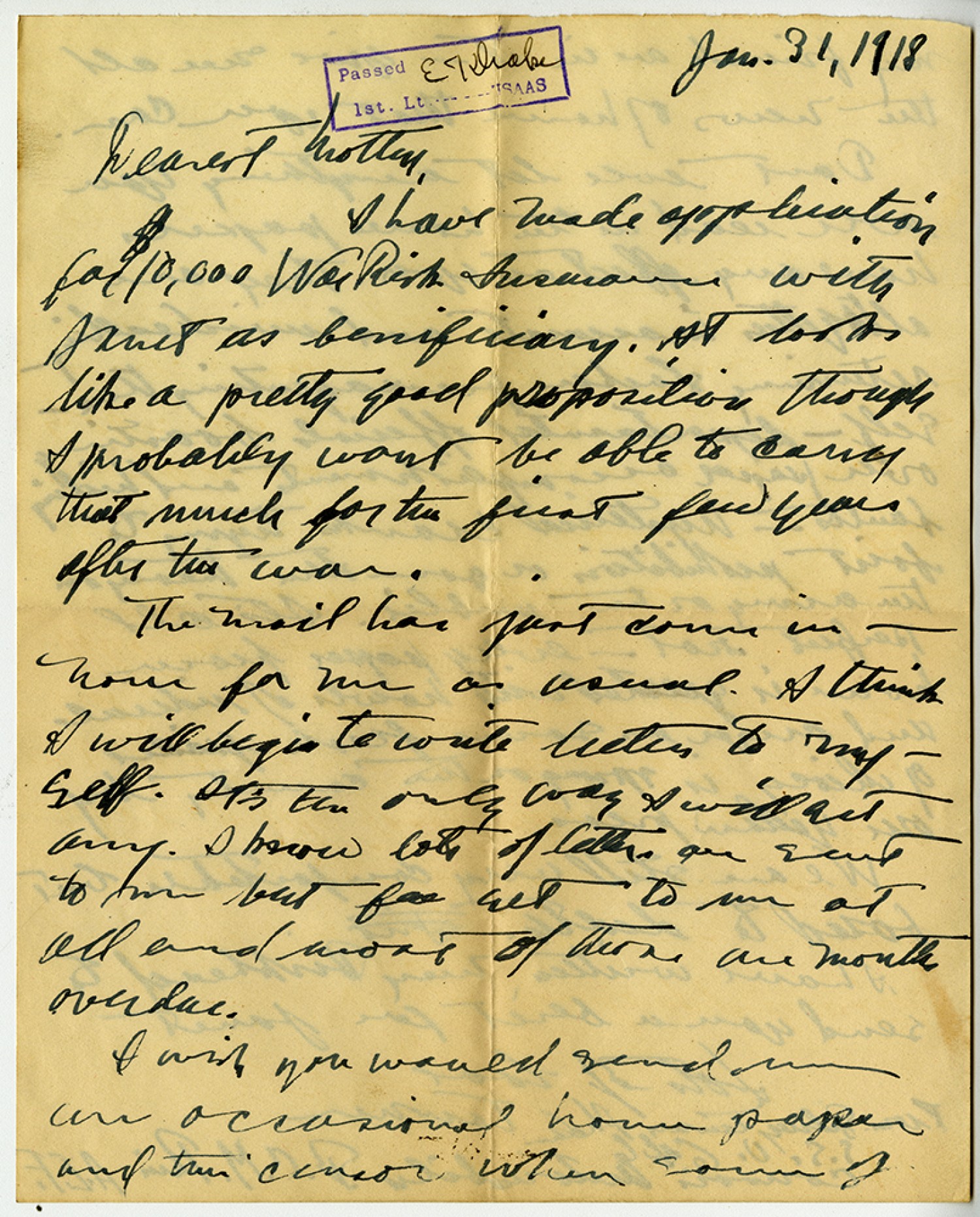 [January] 31, 1918 Dearest Mother, I have made application for $10,000 War Risk Insurance with Janet as beneficiary. It looks like a pretty good proposition though I probably won’t be able to carry that much for the first few years after the war. The mail has just come in---none for me as usual. I think I will begin to write letters to myself. It’s the only way I will get any. I know lots of letters are sent to me but few get to me at all and most of them are months overdue. I wish you would send me an occasional home paper and their censor when some