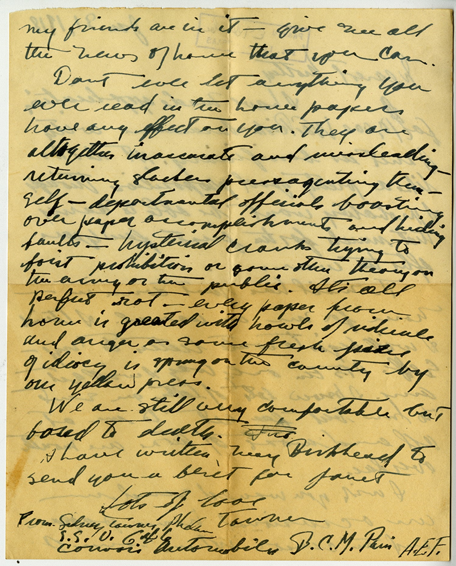 of my friends are in it---give me all the news of home that you can. Don’t ever let anything you ever read in the home papers have any effect on you. They are altogether inaccurate and misleading --- returning slackers pressagenting them-self --- departmental officials boasting over paper accomplishments and hiding faults---hysterical cranks trying to foist prohibition of some other theory on the army or the public. It’s all perfect rot---every paper from home is greeted with howls of ridicule and anger as some fresh piece of idiocy is sprung on the country by the yellow press. We are still very comfortable but bored to death. I have written May Birkhead to send you a beret for Janet. Lots of love, Towner From Sidney Towner Phelan S.S. U. 646 Convois Automobile S.C.M. Paris A.E.F.