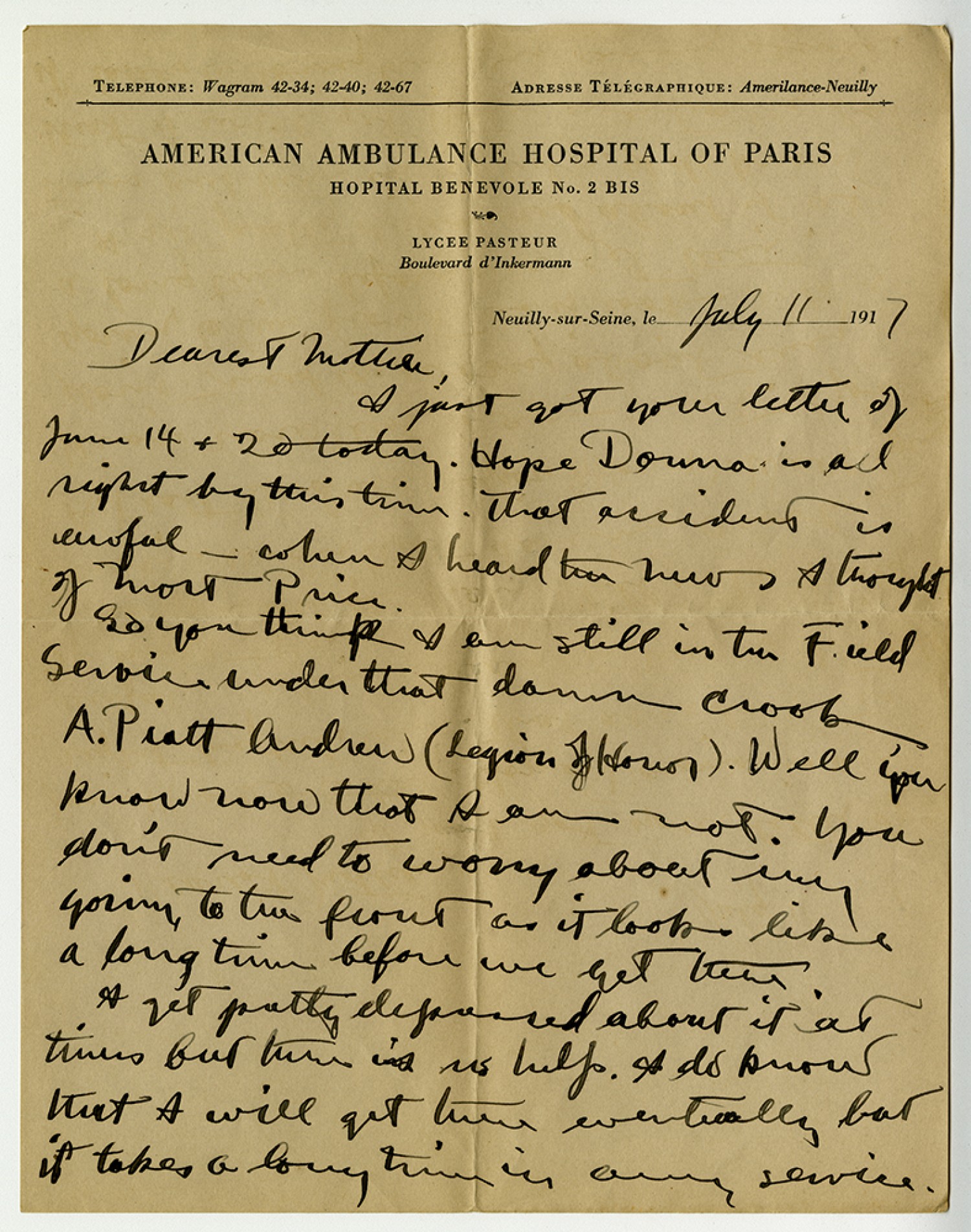 [American Ambulance Hospital of Paris] July 11, 1917 Dearest Mother, I just got your letter of June 14 and 20 today. Hope Donna is all right by this time. That accident is awful when I heard the news I thought of Mort Price. So you think I am still in the Field Service under that damn crook A. Pitt Andrew (Legion of Honor). Well you know now that I am not. You don't need to worry about my going to the front as it looks like a long time before we get there. I get pretty depressed about it at times but that is no help. I do know that I will get there eventually but it takes a long time in army service.