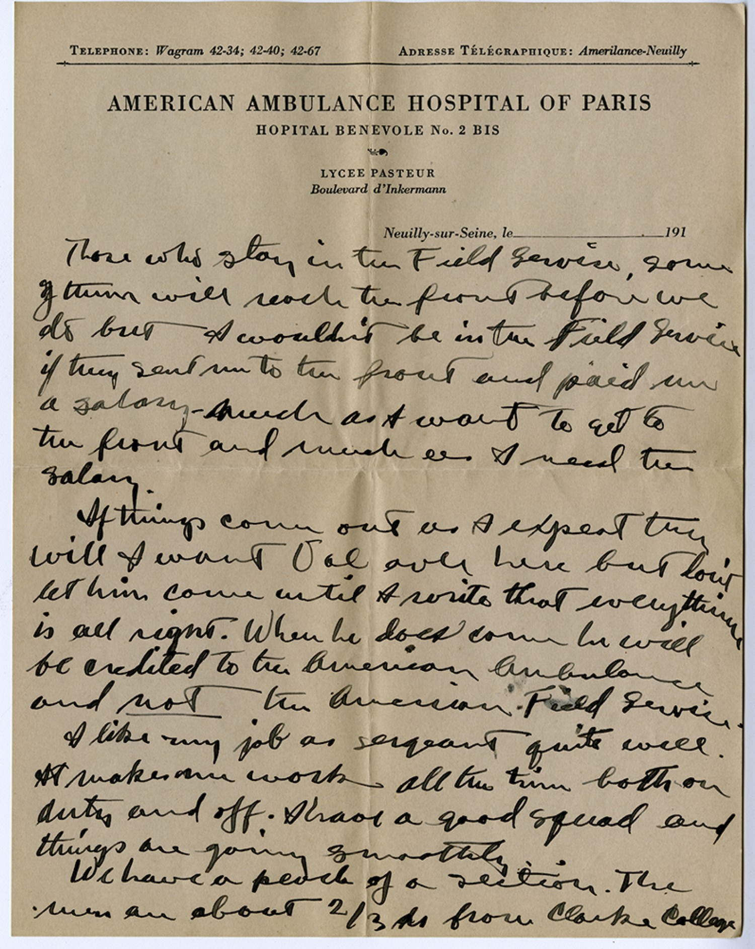 [American Ambulance Hospital of Paris] Those who stay in the Field Service, some of them will reach the front before we do but I wouldn't be in the Field Service if they sent me to the front and paid me a salary much as I want to get to the front and much as I need the salary. If things come out as I expect they will I want Val over here but don't let him come until I write that everything is all right. When he does come he will be credited to the American Ambulance and not the American Field Service. I like my job as sergeant quite well. It makes me work all the time both on duty and off. I have a good squad and things are going smoothly. We have a peach of a section. The men are about 2/3s from Clarke College