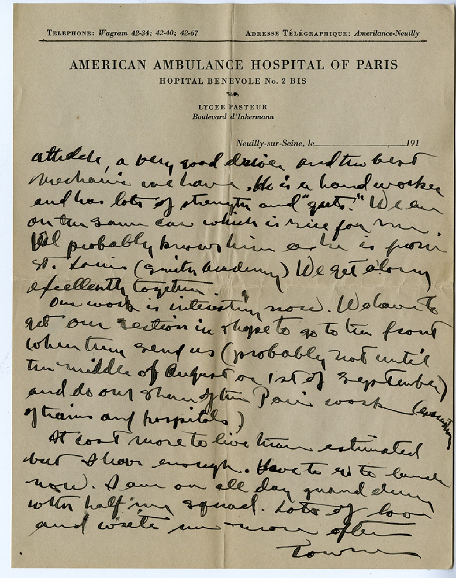 [American Ambulance Hospital of Paris] [ms illegible: 1 wd] , a very good driver and the best mechanic we have. He is a hard worker and has lots of strength and "guts". We are on the same car which is nice for me. Val probably knows him as he is from St. Louis (Smith Academy). We get along excellently together. Our work is interesting now. We have to get our section in shape to go to the front when they send us (probably not until the middle of August or 1st of September) and do our share of the Paris work (evacuation of trains and hospitals). It costs more to live than estimated but I have enough. Have to go to lunch now. I am on all day guard duty with half my squad. Lots of love and write me more often. Towner