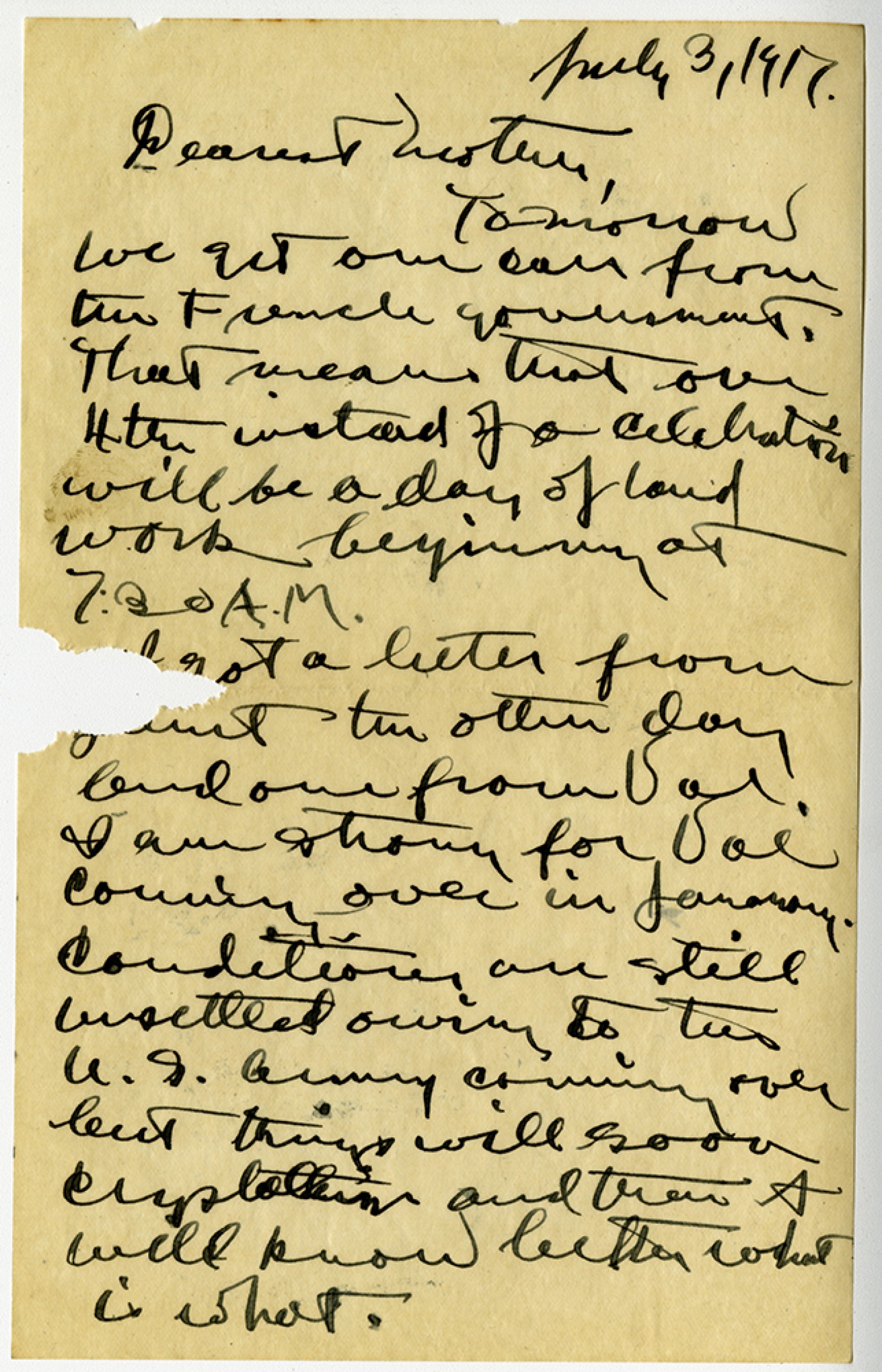July 3, 1917 Dearest Mother, Tomorrow we get our call from the French government, that means that our 4th instead of a celebration will be a day of hard work beginning at 7:30 A.M. I got a letter from Janet the other day and one from Val! I am strong for Val coming over in January. Conditions are still unsettled owing to the U. S. Army coming over but things will soon crystalize and then I will know better what is what.