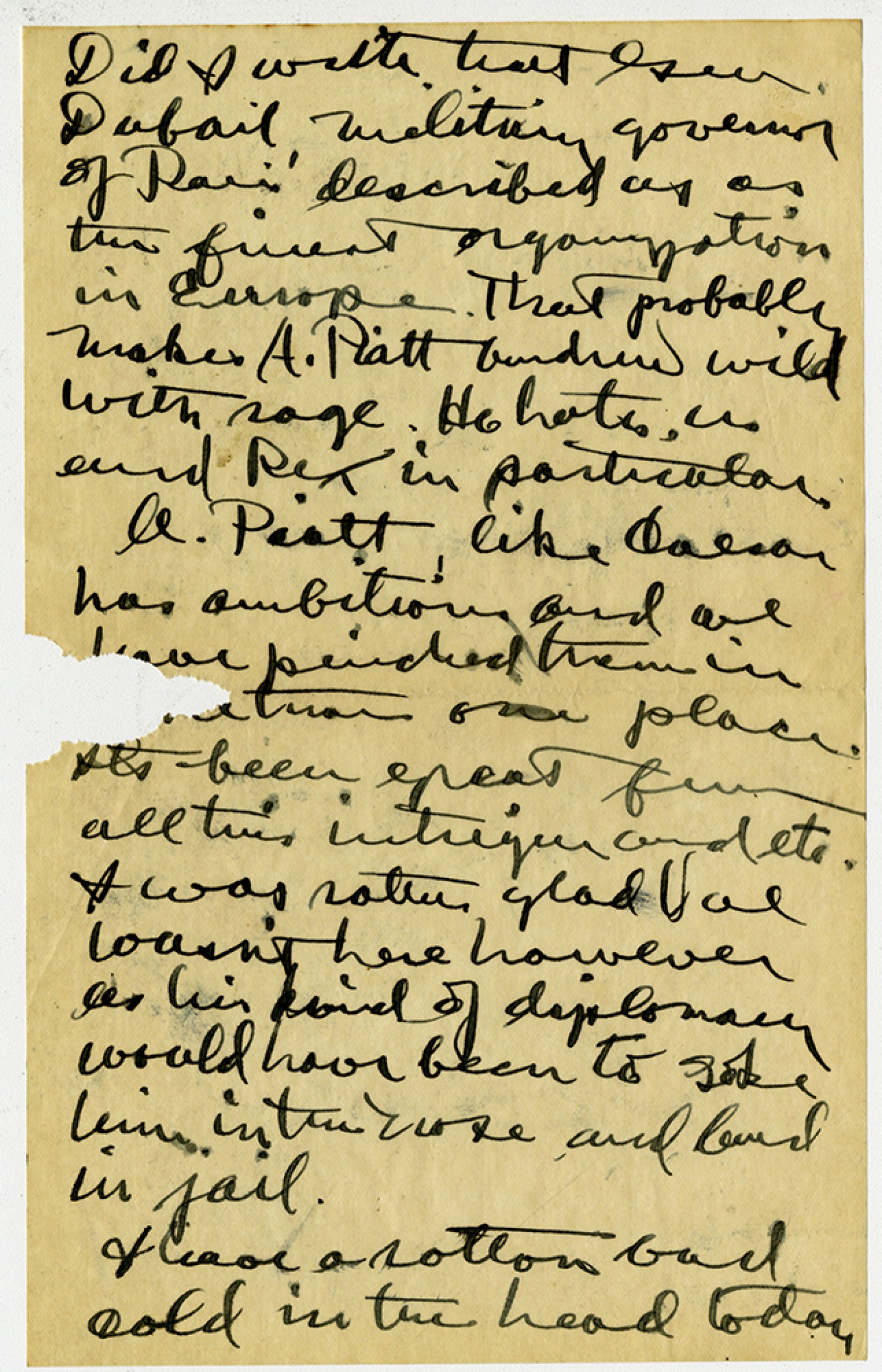 Did I write that Gen. Dabble, military governor of Paris described us as the finest organization in Europe. That probably makes A. Pitt Andrew wild with rage. He hates us and Rex in particular. A. Piatt, like Caesar has ambitions and we have pinched them in [ms illegible: 1 wd] one place. Its been great fun all this intrigue and etc. I was rather glad Val wasn't here however as his kind of diplomacy would have been to poke him in the nose and land in jail. I have a rotten bad cold in the head today