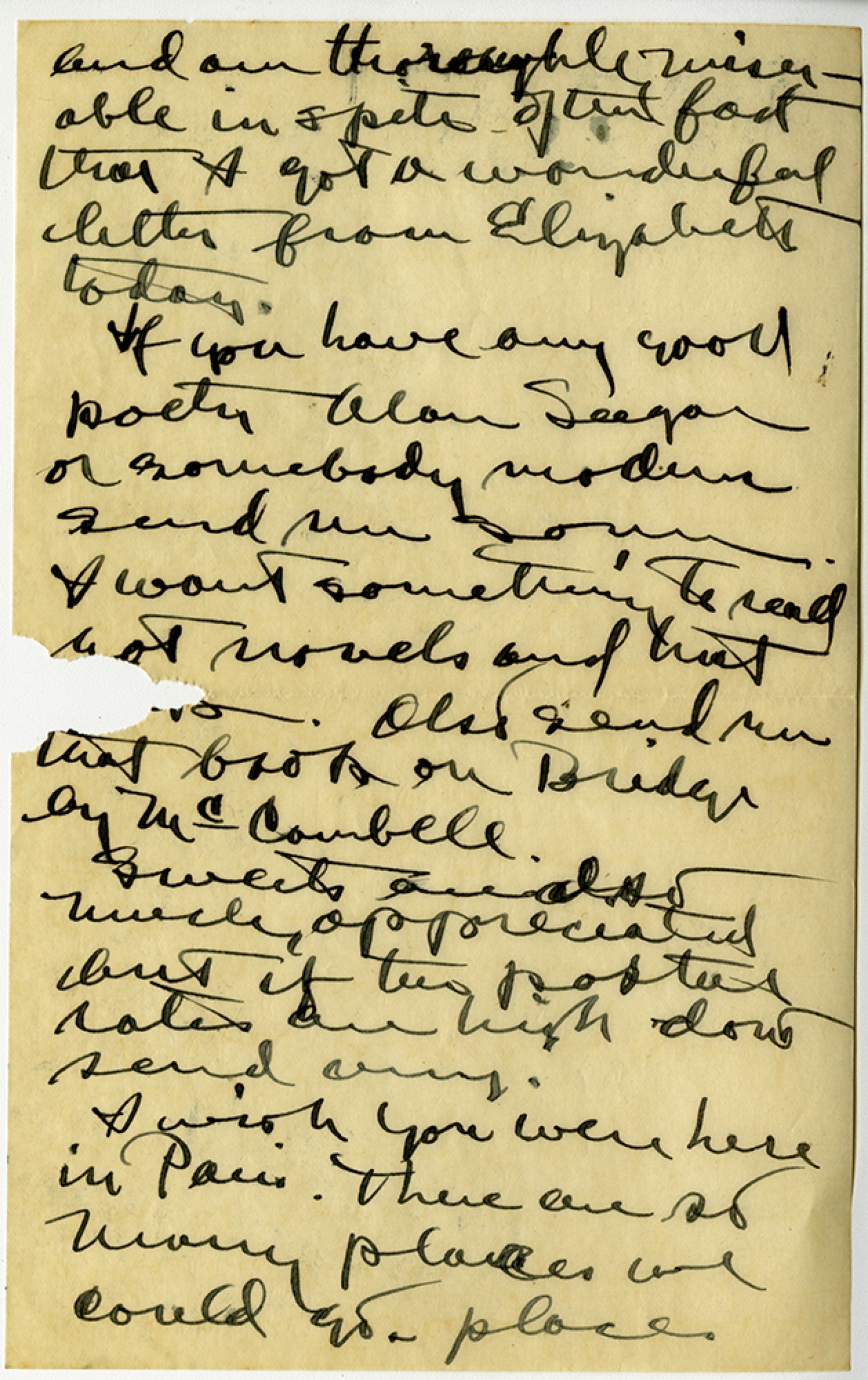 and am thoroughly miserable in spite of the fact that I got a wonderful letter from Elizabeth today. If you have any good poetry Alan Seegar or somebody modern send me some. I want something to read not novels and that. Also send me that book on Bridge by McCombell. Sweets are also much appreciated but if the postal rates are high don’t send any. I wish you were here in Paris. There are so many places we could go. Place