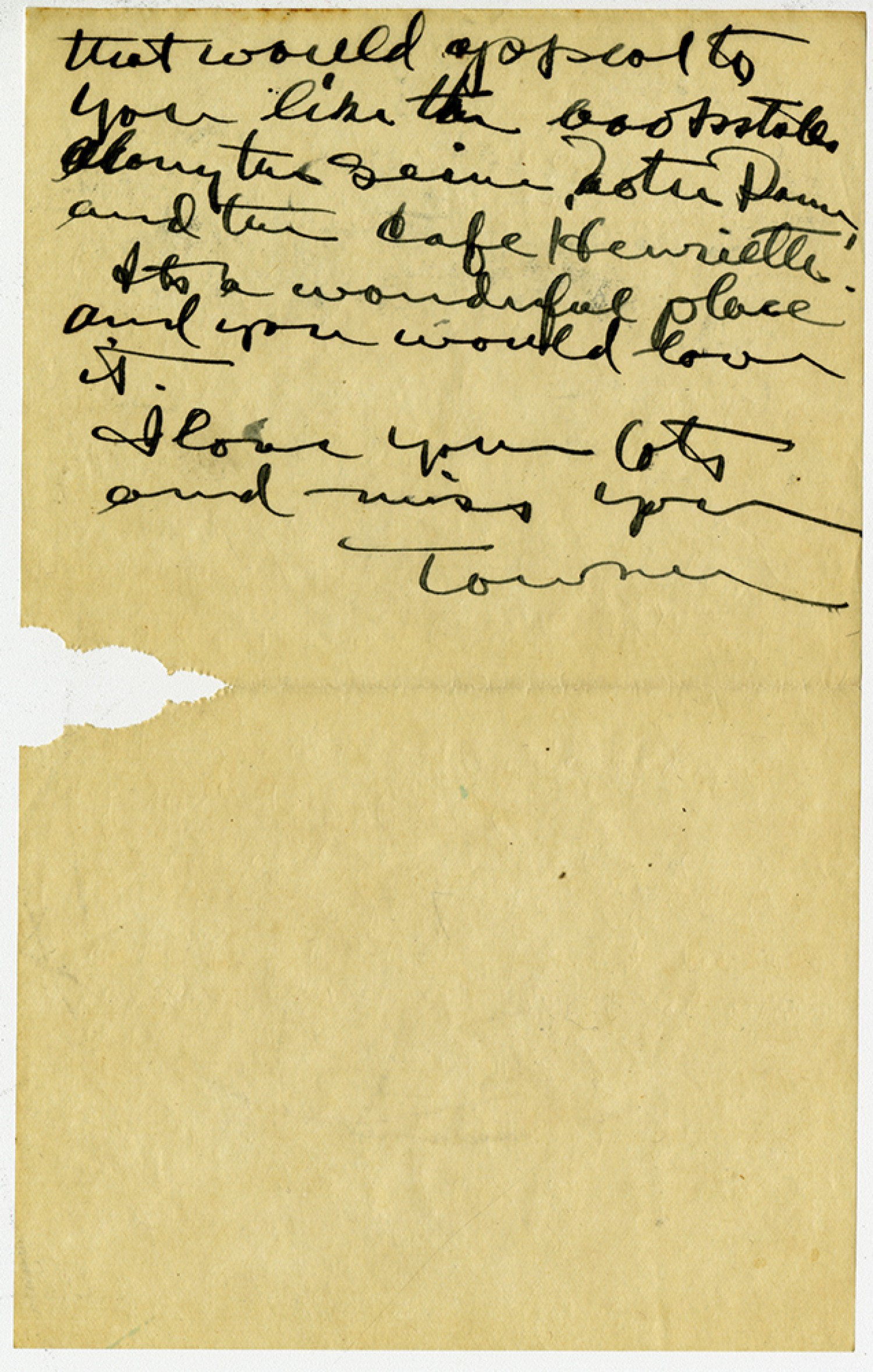 that would appeal to you like the bookstalls along the Seine, Notre Dame and the Cafe Henriette. It's a wonderful place and you would love it. I love you lots and miss you. Towner