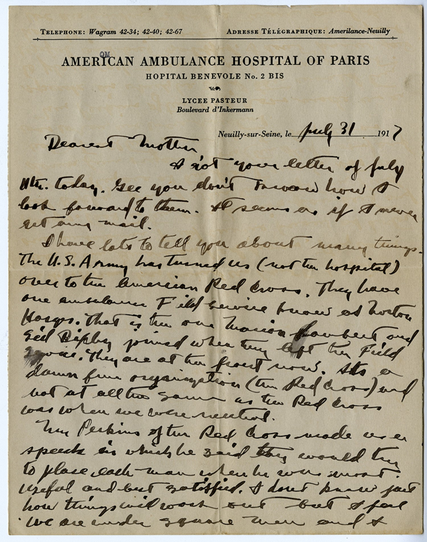 [American Ambulance Hospital of Paris] July 31, 1917 Dearest Mother, I got your letter of July 11th today. Gee you don't know how I look forward to them. It seems as if I never get any mail. I have lots to tell you about many things. The U. S. Army has turned us over to the American Red Cross. They have one ambulance field service known as Norton Harges. That is the one Marion Lambert and Sid Ripley joined when they left the Field Service. They are at the front now. It's a damn fine organization (the Red Cross) and not at all the same as the Red Cross was when we were neutral. Mr. Perkins of the Red Cross made us a speech in which he said they would try to place each man where he was most useful and best satisfied. I don't know just how things will work out but I feel we are under square men and I