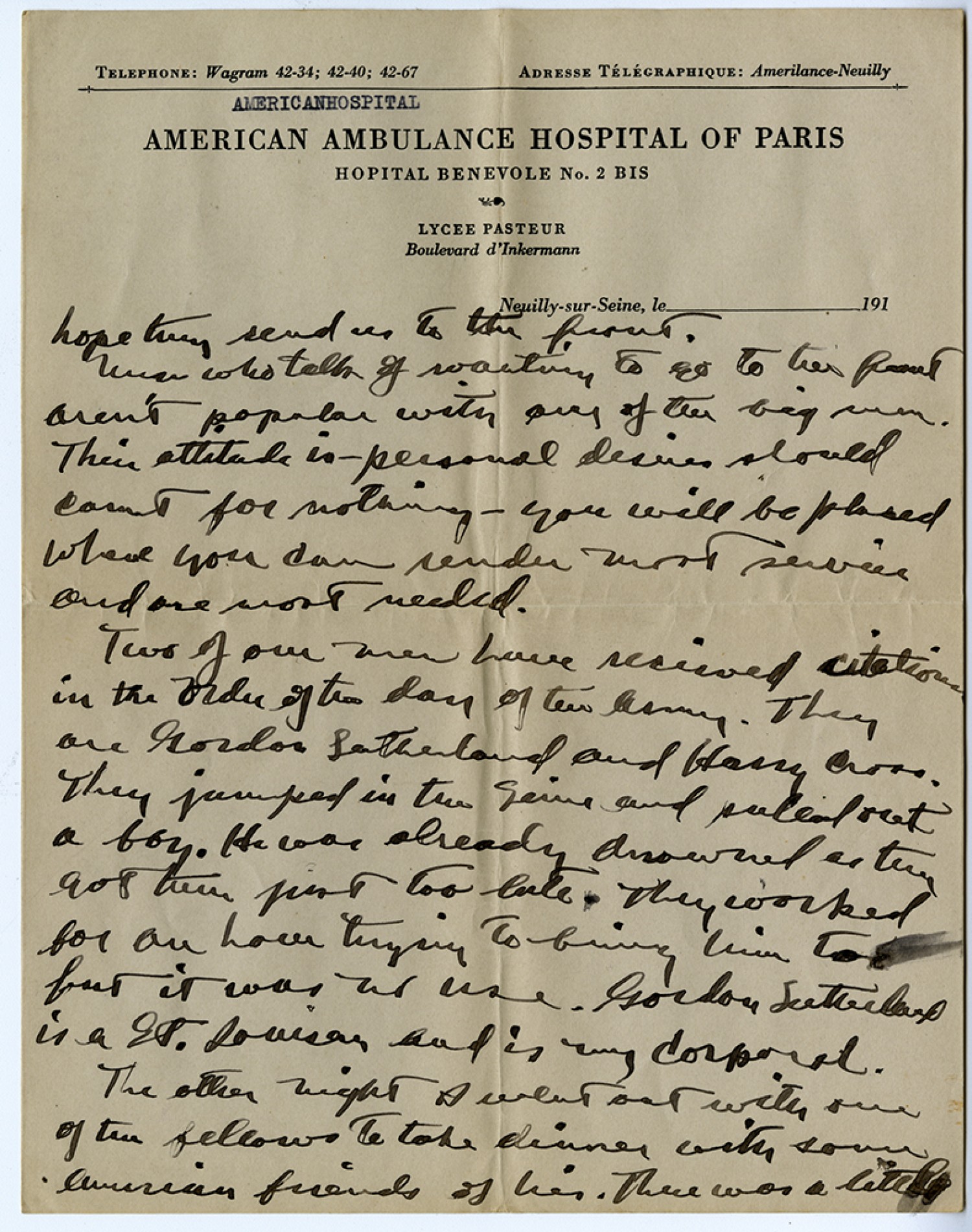 [American Ambulance Hospital of Paris] hope they send us to the front. Men who talk of wanting to go to the front aren't popular with any of the big men. Their attitude is personal desires should count for nothing you will be placed where you can render most service and are most needed. Two of our men have received citations in the Order of the Day of the Army. They are Gordon Sutherland and Harry Cross. They jumped in the Seine and pulled out a boy. He was already drowned as they got him just too late. They worked for an hour trying to bring him to but it was no use. Gordon Sutherland is a St. Louisan and is my corporal. The other night I went out with one of the fellows to take dinner with some American friends of his. There was a little