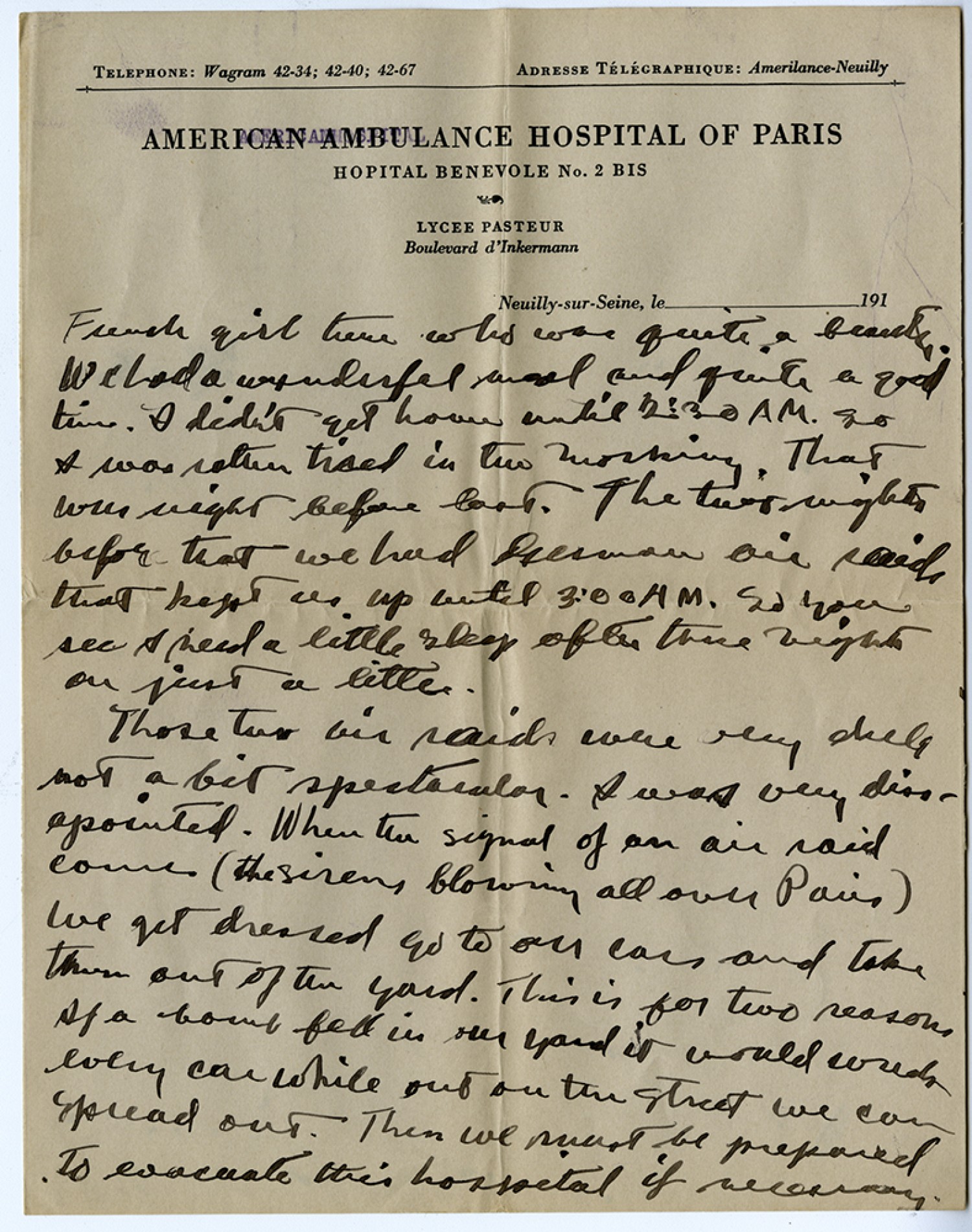 [American Ambulance Hospital of Paris] French girl there who was quite a beauty. We had a wonderful meal and quite a good time. I didn't get home until 2:30 A. M. so I was rather tired in the morning. That was night before last. The two nights before that we had Immerman air raids that kept us up until 3:00 A. M. So you see I need a little sleep after three nights on just a little. Those two air raids were very dull, not a bit spectacular. I was very disappointed. When the signal of an air raid comes (the sirens blowing all over Paris) we get dressed go to our cars and take them out of the yard. This is for two reasons. If a bomb fell in the yard it would wreck every car while out on the street we can spread out. Then we must be prepared to evacuate this hospital if necessary.