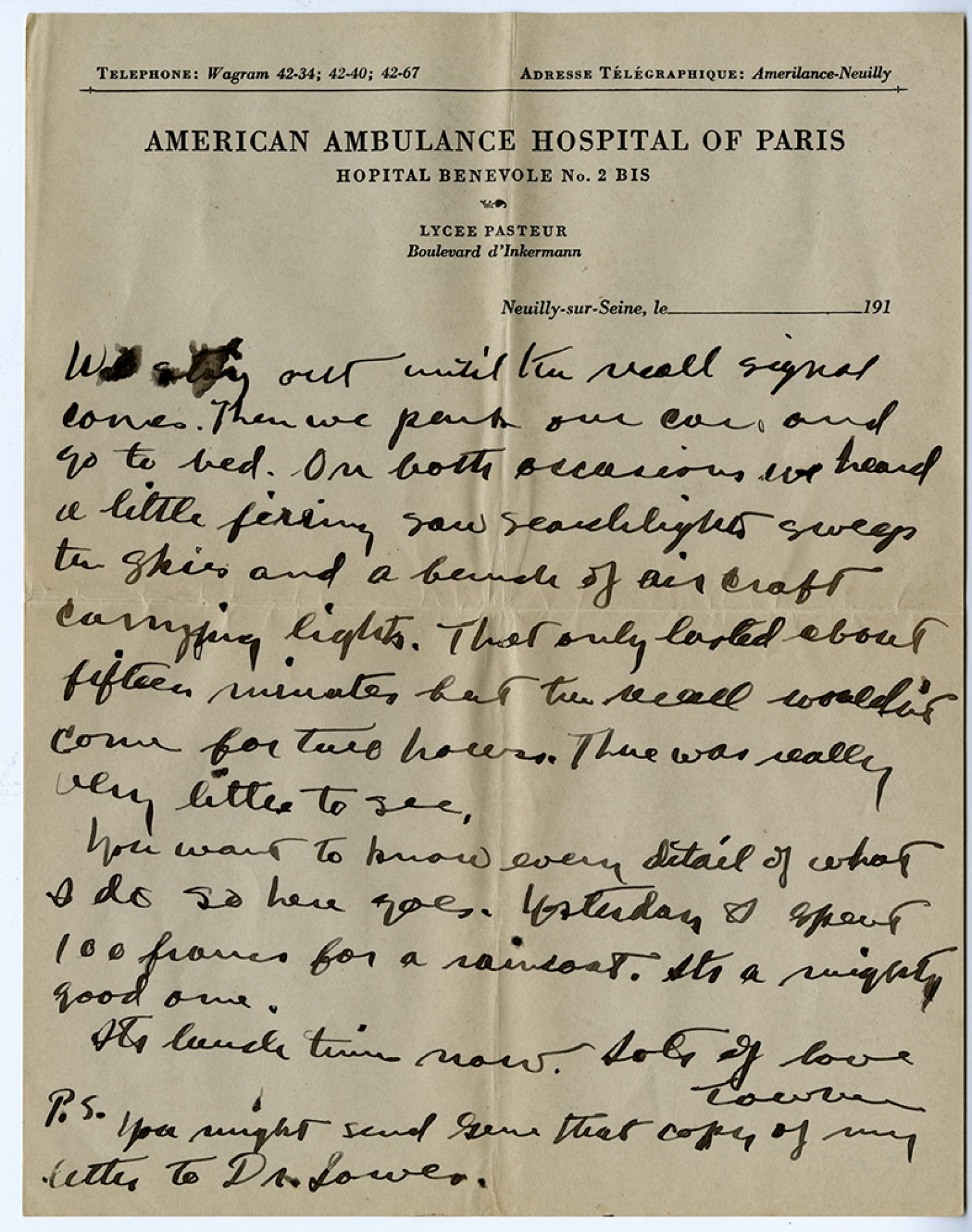 [American Ambulance Hospital of Paris] We stay out until the recall signal comes. Then we park our cars and go to bed. On both occasions we heard a little firing saw searchlights sweep the skies and a bunch of aircraft carrying lights. That only lasted about fifteen minutes but the recall wouldn't come for two hours. There was really very little to see. You want to know every detail of what I do so here goes. Yesterday I spent 100 francs for a raincoat. It's a mighty good one. It's lunch time now. Lots of love Towner P.S. You might send Gene that copy of my letter to Dr. Lowe.