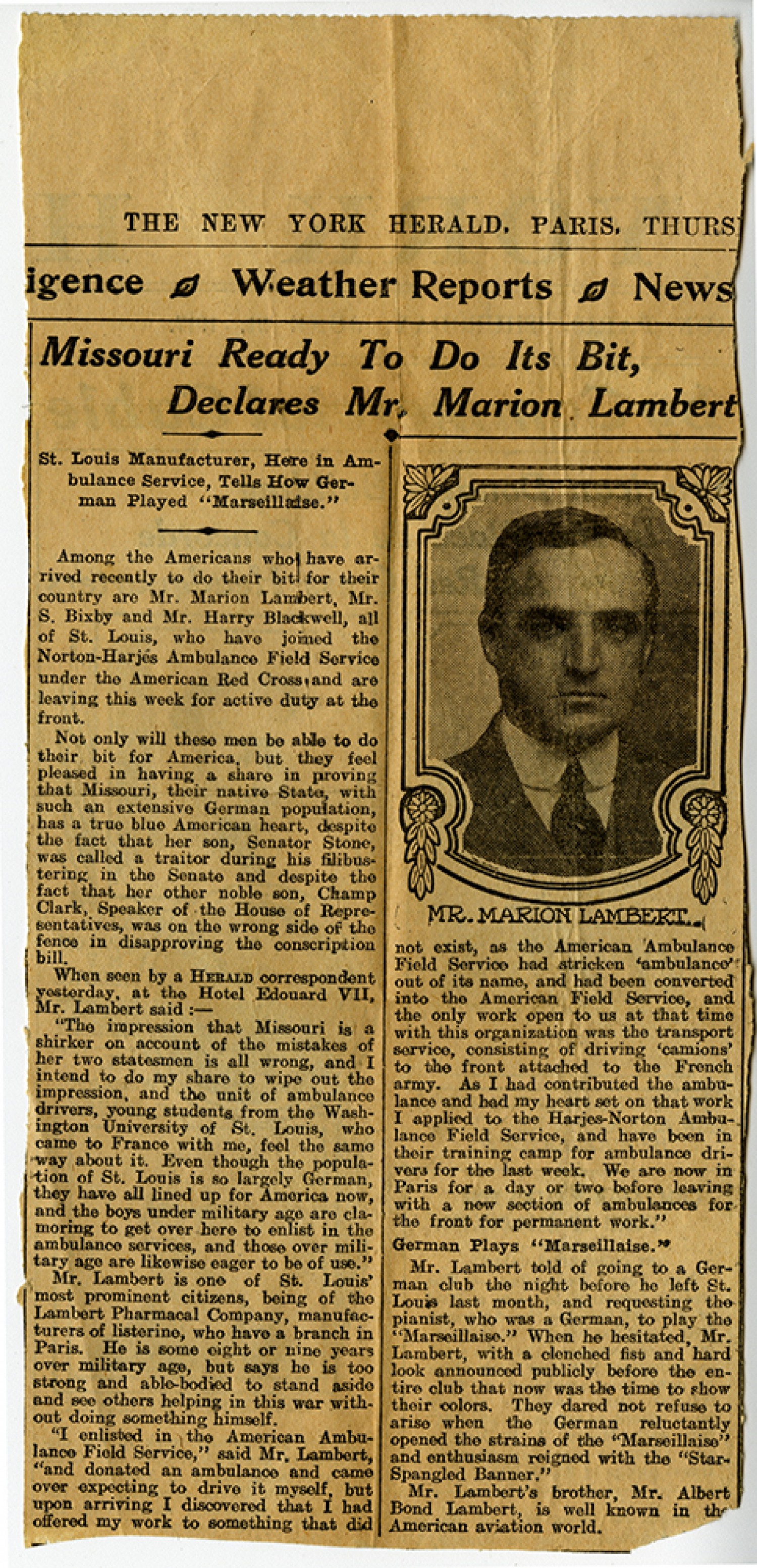 [Newspaper clipping] Missouri Ready To Do Its Bit, Delcares Mr. Marion Lambert St. Louis Manufacturer, Here in Ambulance Service, Tells How German Played "Marseillaise."