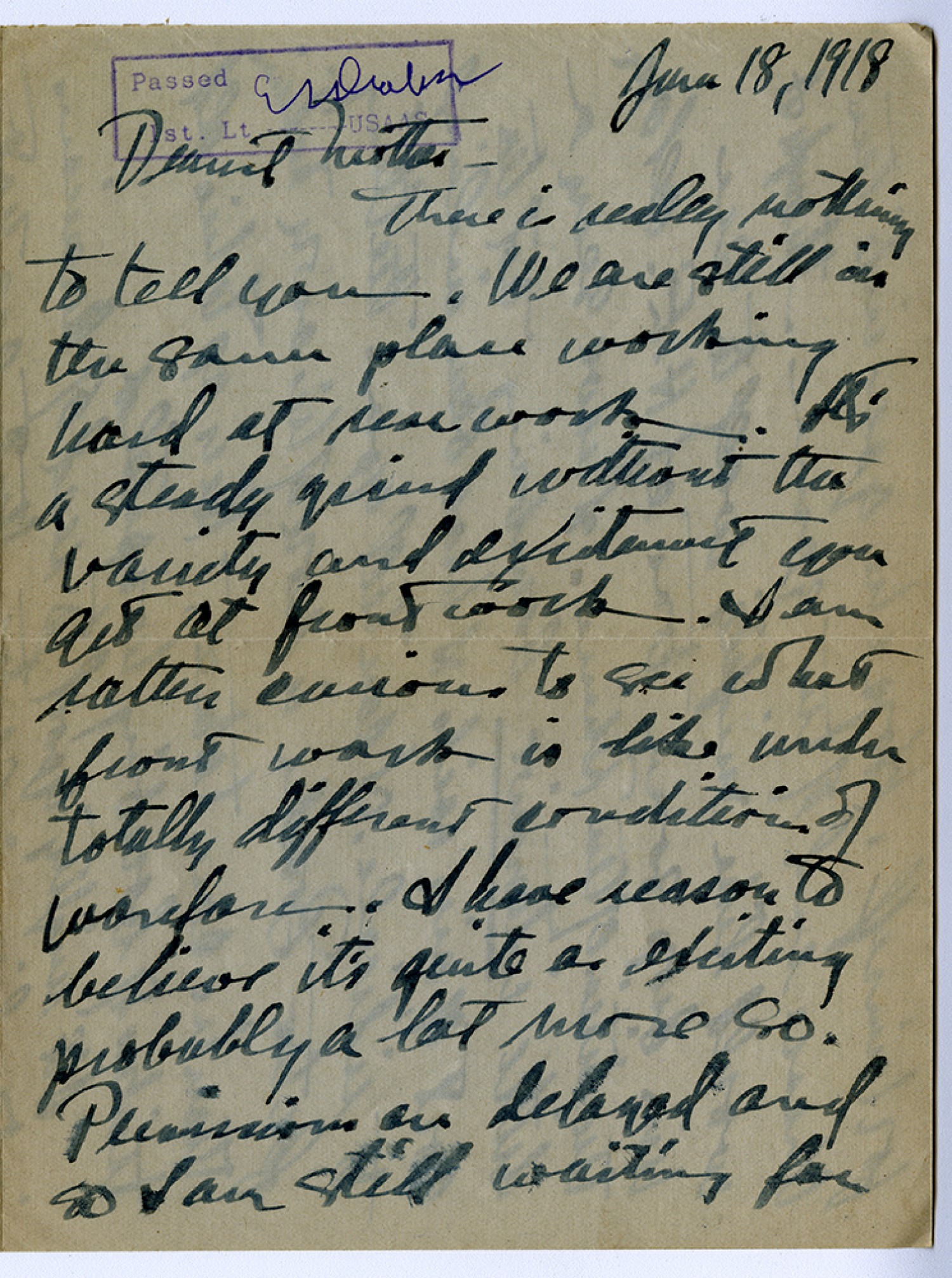 June 18, 1918 [censor’s stamp] Dearest Mother, There is really nothing to tell you. We are still in the same place working hard at rear work. It's a steady grind without the variety and excitement you get at front work. I am rather curious to see what front work is like under totally different conditions of warfare. I have reason to believe it's quite as exciting probably a lot more so. Permission is delayed and so I am still waiting for