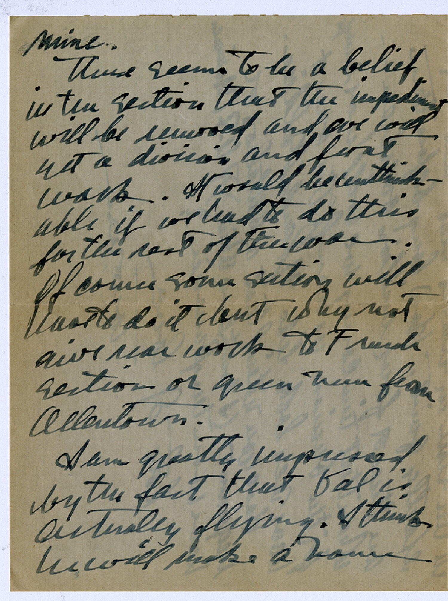 mine. There seems to be a belief in the section that the impediment will be removed and we will get a division and front work. It would be unthinkable if we had to do this for the rest of the war. Of course some section will have to do it then why not give the work to French sections or green men from Allentown. I am greatly impressed by the fact that Val is actually flying. I think he will make a name