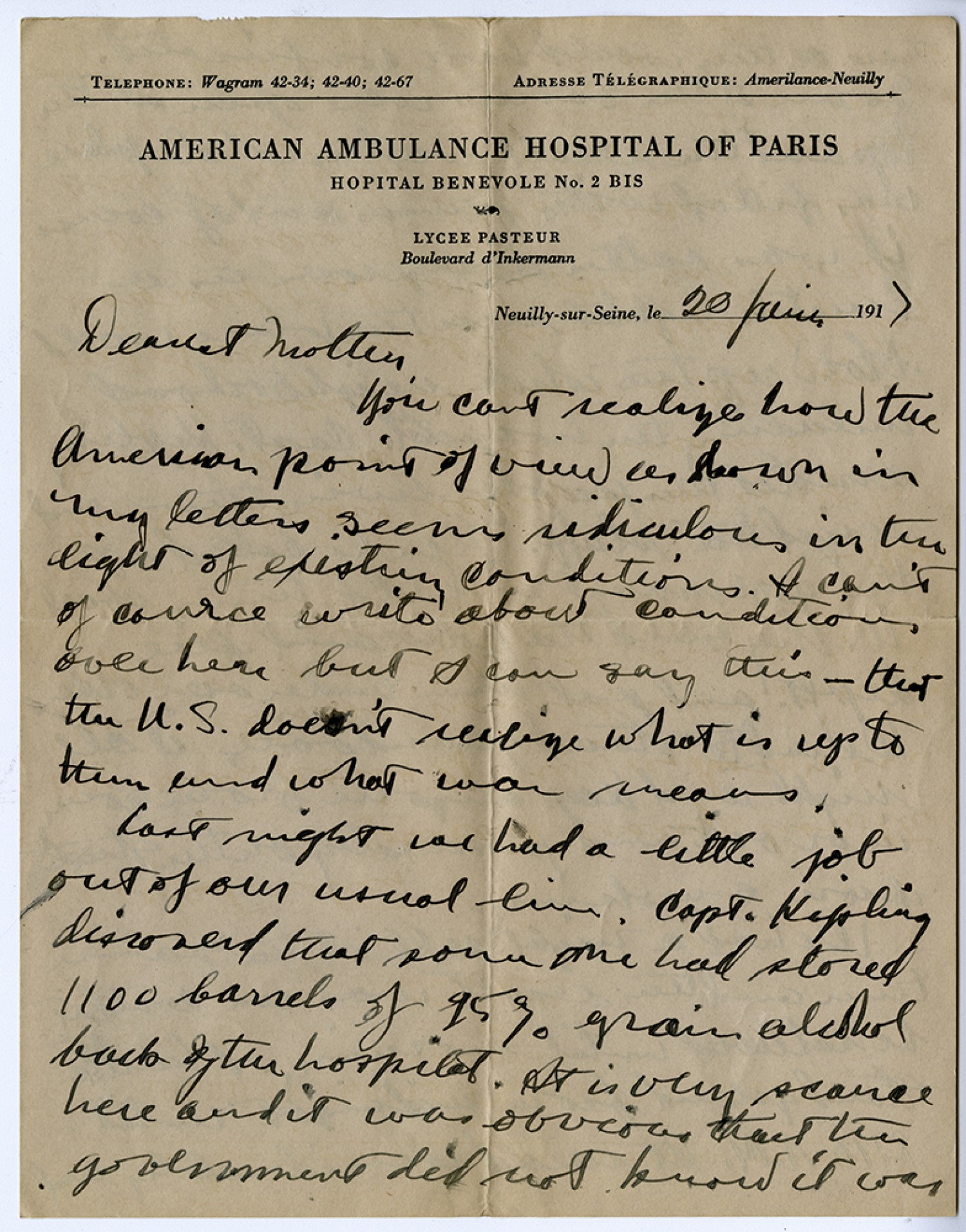 [American Ambulance Hospital of Paris letterhead] 20 June 1917 Dearest Mother, You can't realize how the American point of view as shown in my letters seems ridiculous in the light of existing conditions. I can't of course write about conditions over here but I can say this that the U. S. doesn't realize what is up to them and what war means. Last night we had a little job out of our usual line. Capt. Kipling discovered that someone had stored 1100 barrels of 95% grain alcohol back of the hospital. It is very scarce here and it was obvious that the government did not know it was