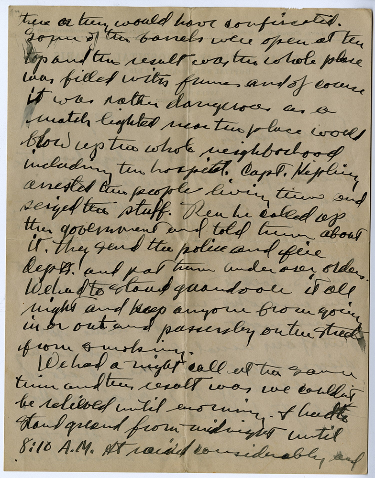 there or they would have confiscated. Some of the barrels were open at the top and the result was the whole place was filled with fumes and of course it was rather dangerous as a match lighted near the place would blow up the whole neighborhood including the hospital. Capt. Kipling arrested two people living there and seized the stuff. Then he called up the government and told them about it. They sent the police and fire departments and put them under our orders. We had to stand guard over it all night and keep anyone from going in or out and passersby on the street from smoking. We had a night call at the same time and the result was we couldn't be relieved until morning. I had to stand guard from midnight until 8:10 A. M. It rained considerably and