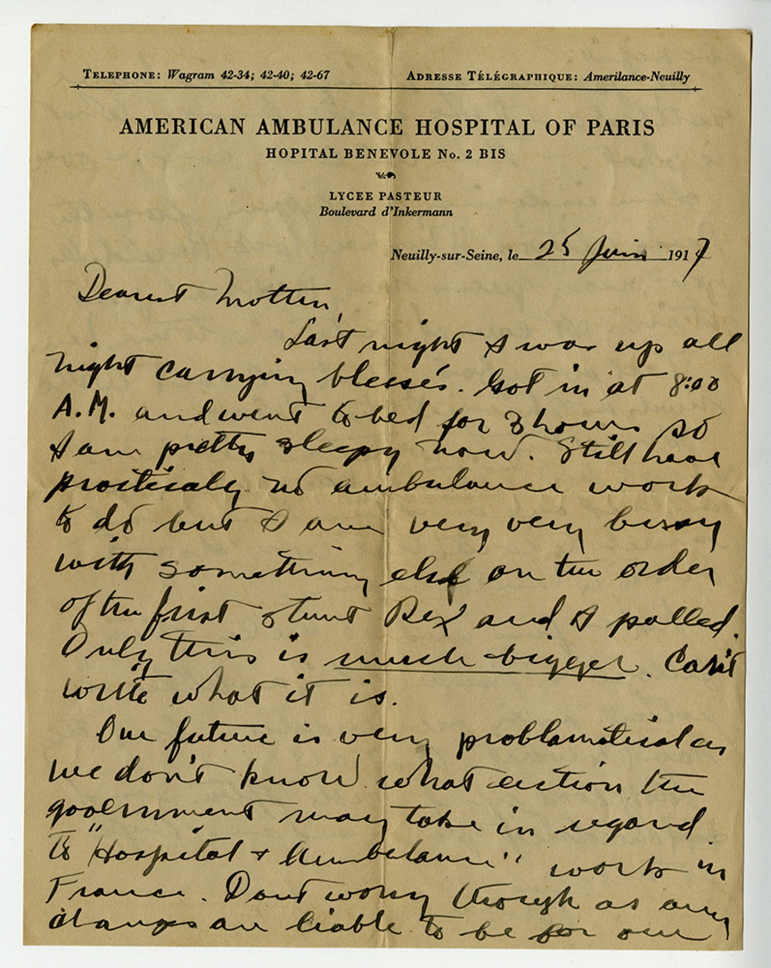[American Ambulance Hospital of Paris letterhead] 25 June 1917 Dearest Mother, Last night I was up all night carrying blesses. Got in at 8:00 a.m. and went to bed for three hours so I am pretty sleepy now. Still have practically no ambulance work to do but I am very very busy with something else on the order of the first stunt Rex and I pulled. Only this is much bigger. Can't write what it is. Our future is very problematical as we don't know what action the government may take in regard to "Hospital and Ambulance" work in France. Don't worry though as any changes are liable to be for our