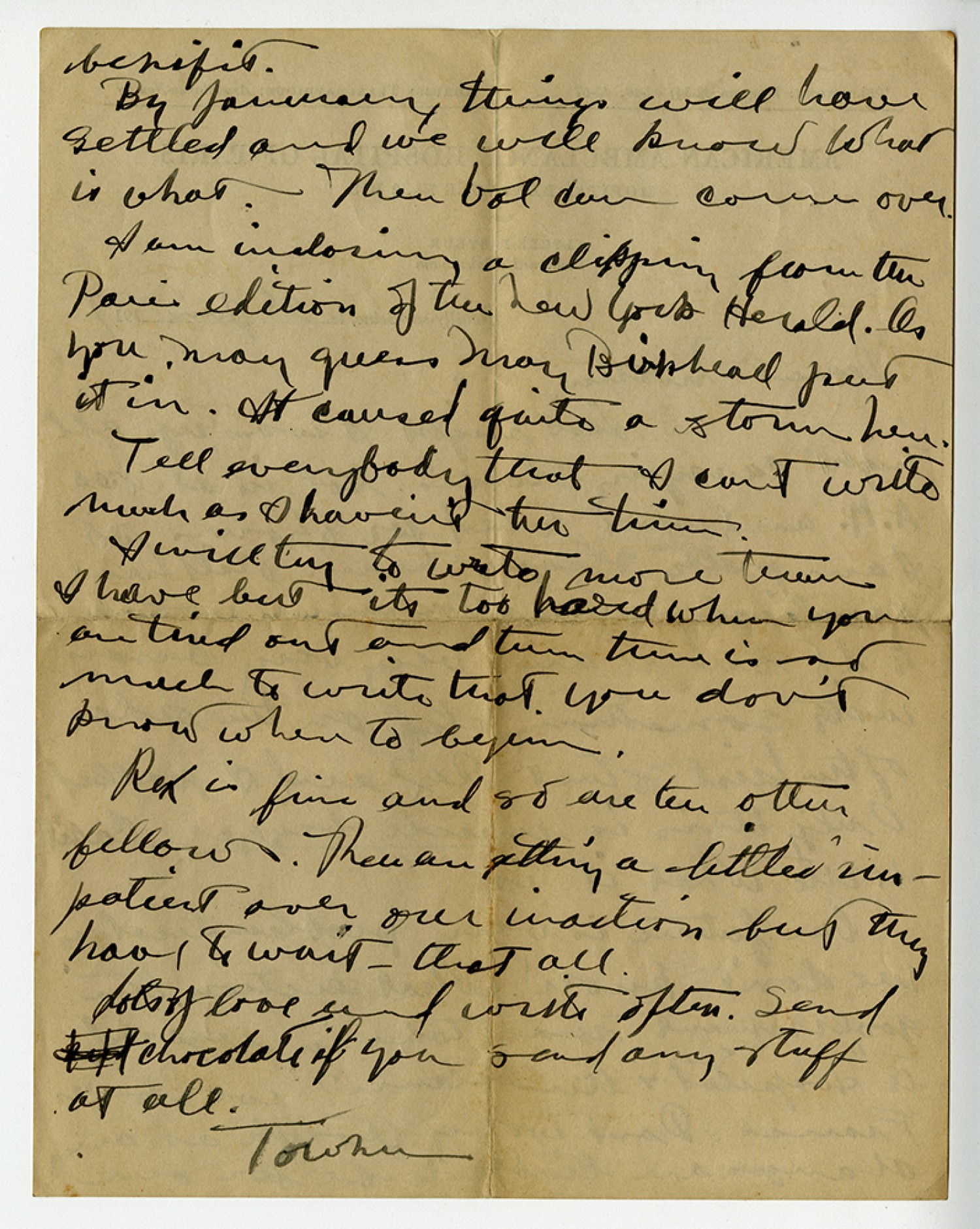 benefit. By January things will have settled and we will know what is what. Then Val can come over. I am enclosing a clipping from the Paris edition of the New York Herald. As you may guess May Birkhead put it in. It caused quite a storm here. Tell everybody that I can't write much as I haven't the time. I will try to write more than I have but it's too hard when you are tired out and then there is so much to write that you don't know where to begin. Rex is fine and so are the other fellows. They are getting a little impatient over our inaction but they have to ait that's all. Lots of love and write often. Send chocolate if you send any stuff at all. Towner